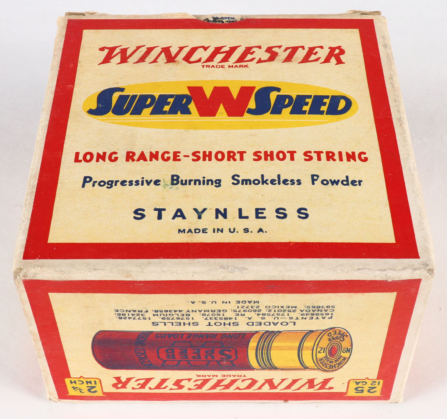Winchester, Super W Speed, 12ga., Staynless, 2 3/4 in., 1pc., Full, shot size 6CH, cream red, blue and yellow box, box is very solid with great colors, paper shells are excellent. Grade: Excellent ++ - Value: 20 to 60