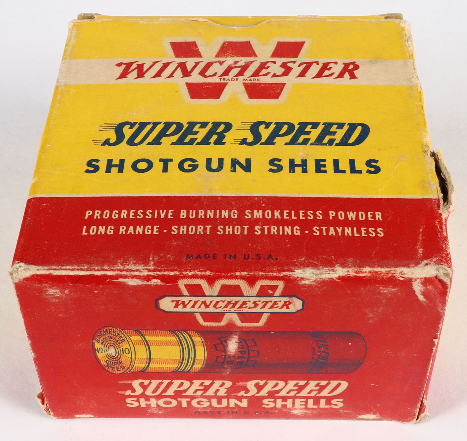 Winchester, Super Speed, 10ga., 1pc., Full, 2 7/8'', shot size BB, red, yellow & blue box, box has shell protrusions, paper shells are excellent. Grade: Very Good ++ - Value: 20 to 100