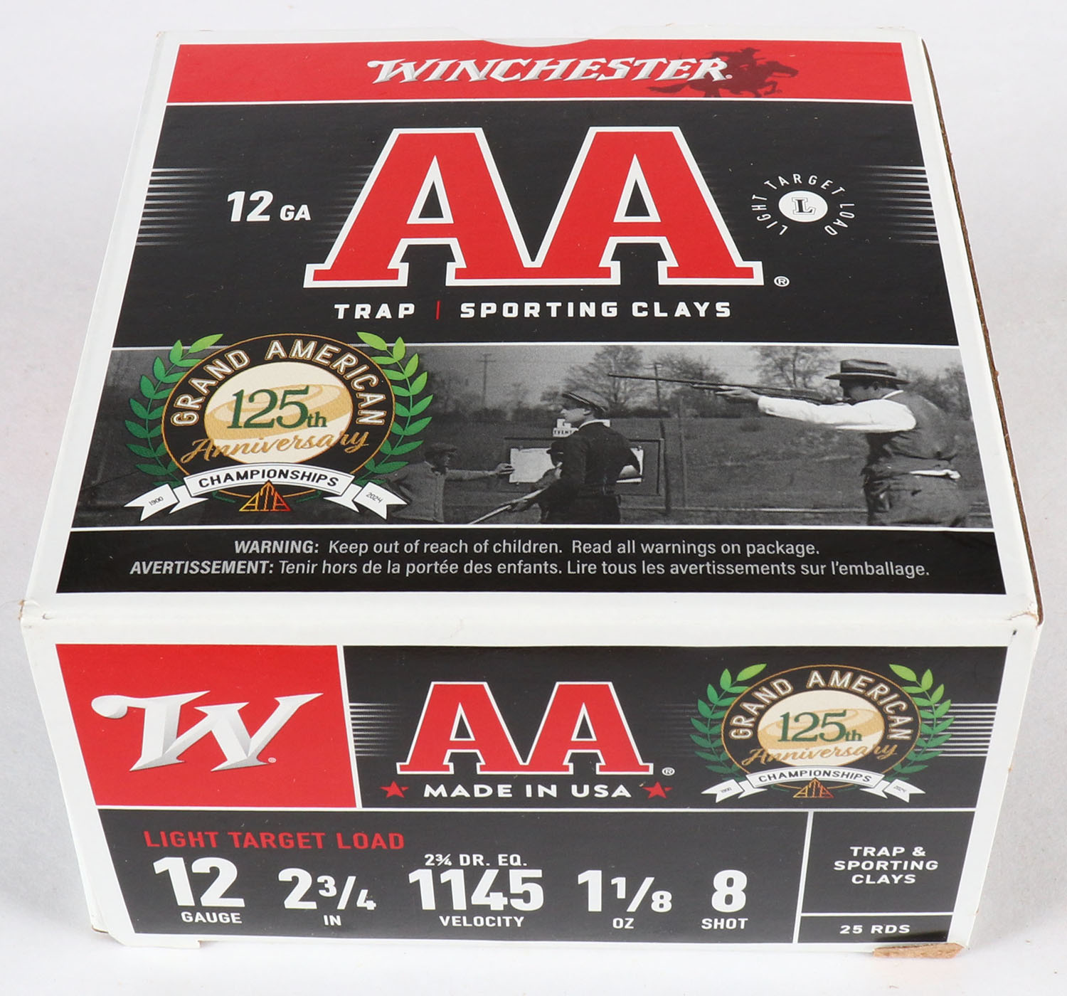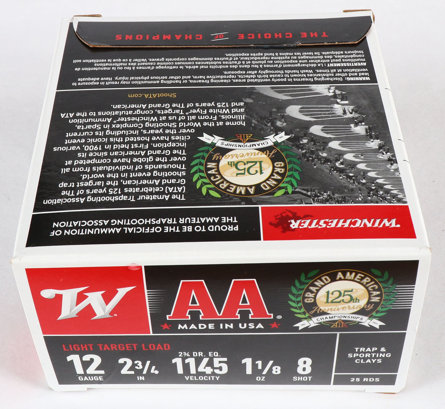 Winchester, Grand American 125th Anniversary, 12ga., 1pc., Full, shot size 8, box is very solid with excellent colors, plastic shells are excellent. Grade: MINT - Value: 20 to 80