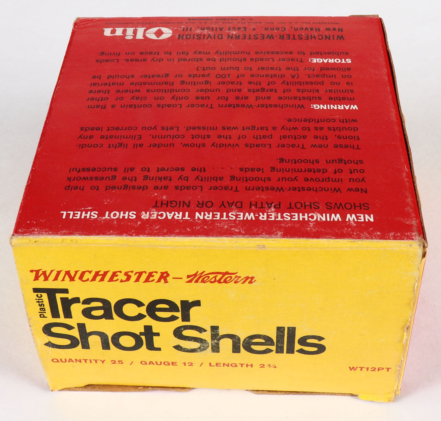 Winchester-Western, Tracer Shot Shells, Visible Day or Night, 12ga., 2 3/4'', 1pc., Full, shot size 8, multi-colored box, box is very solid with minor scuffing, plastic shells are excellent. Grade: Excellent + - Value: 10 to 50