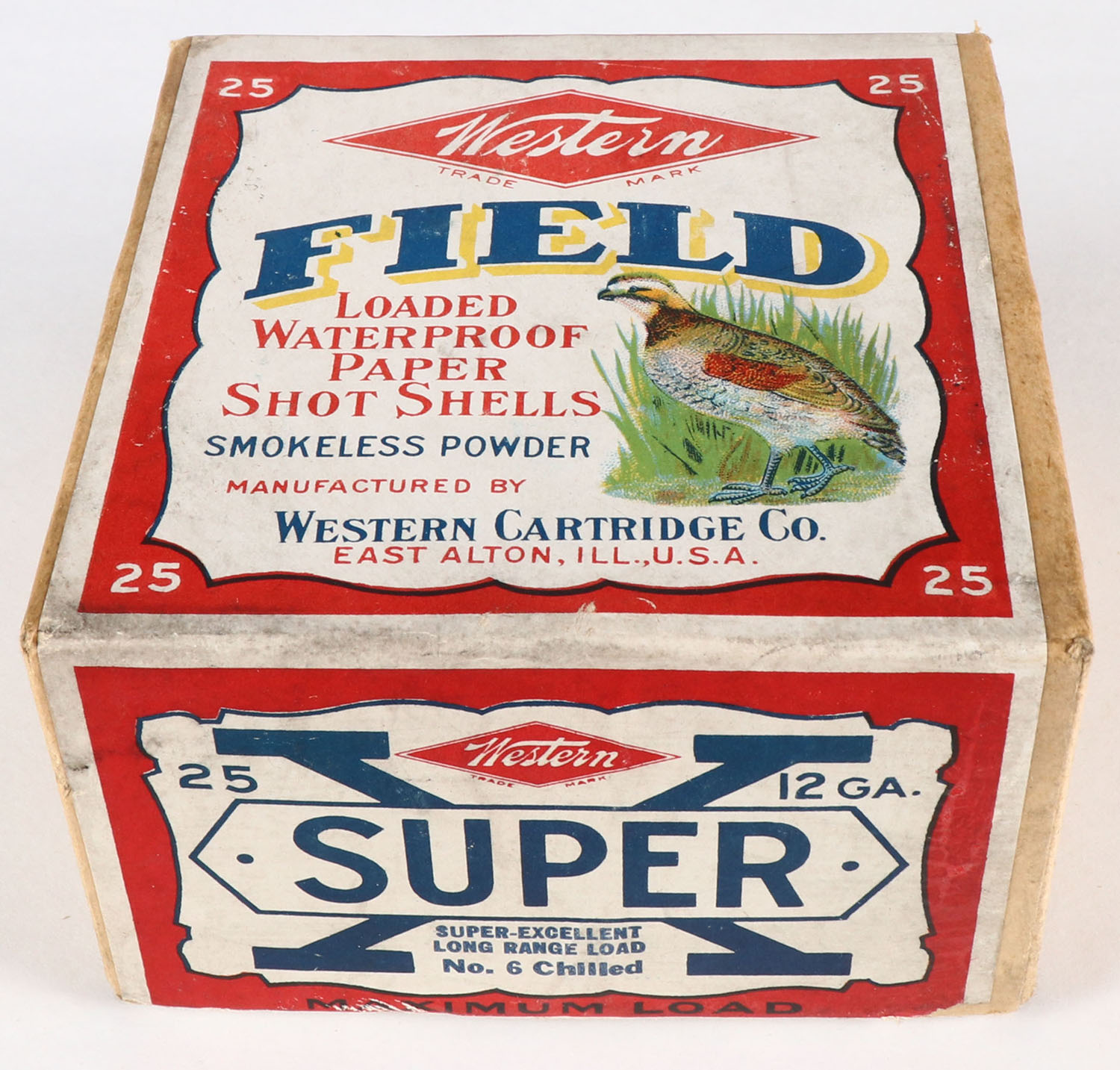 Western, Field/Super X, Label was made during transition from Field boxes to Super X boxes. 12ga., 2pc, Empty, shot size 6 Ch, box is very solid with excellent colors, has scuffing. Grade: Very Good ++ - Value: 20 to 100