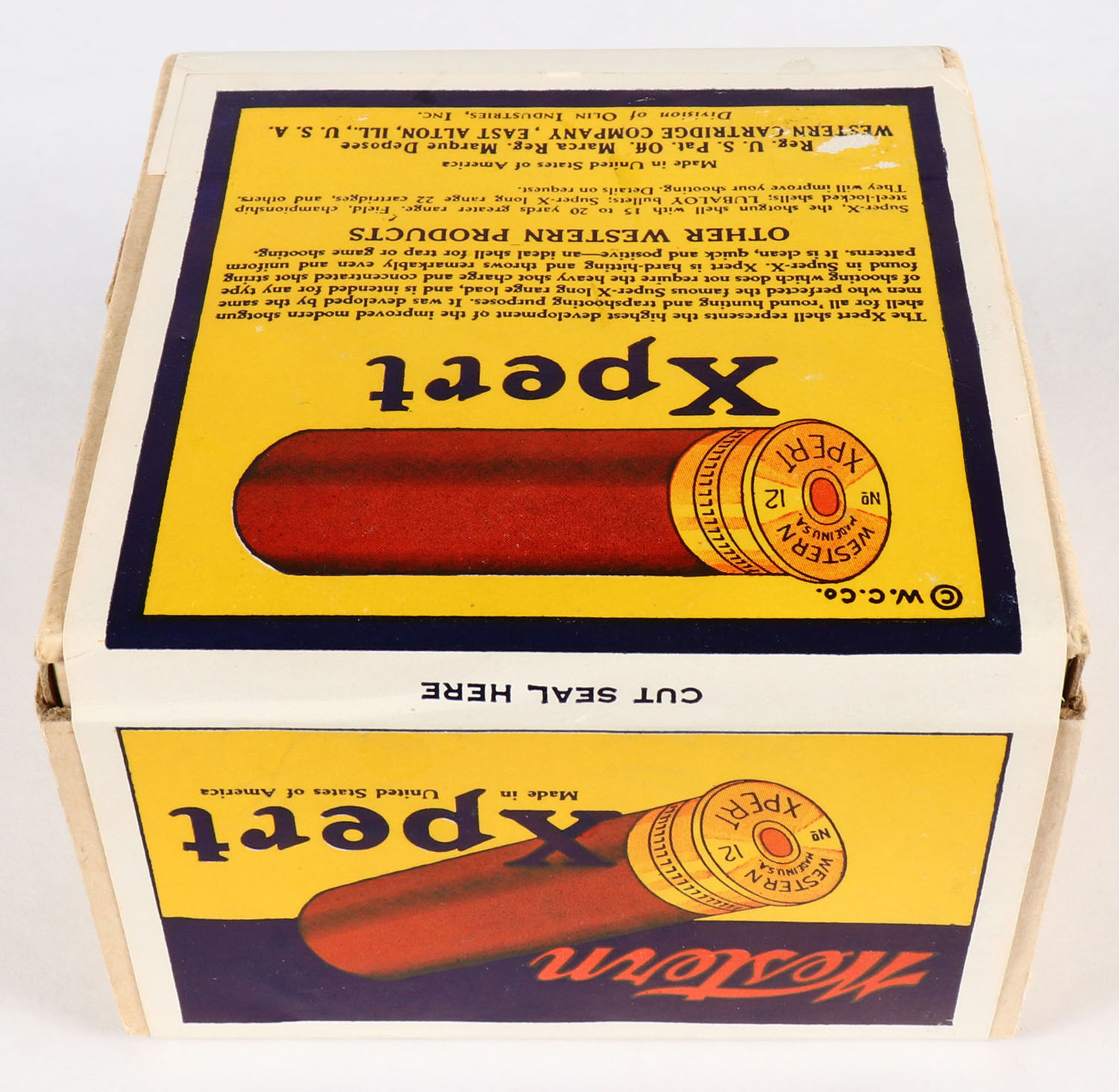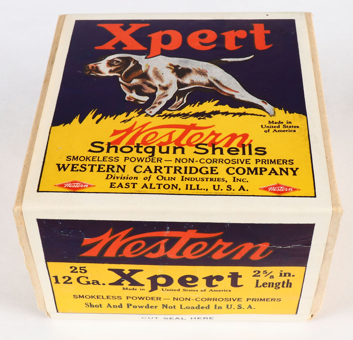 Western, Xpert, 12ga., 2 5/8'', 2pc., FULL & SEALED, (Update 11/19: according to consignor the box contains empty shells, no shot or powder loaded, made this way for export.) Shot size ?, blue, yellow & red box with a dog on point, box is very solid with great color. Grade: MINT - Value: 40 to 200
