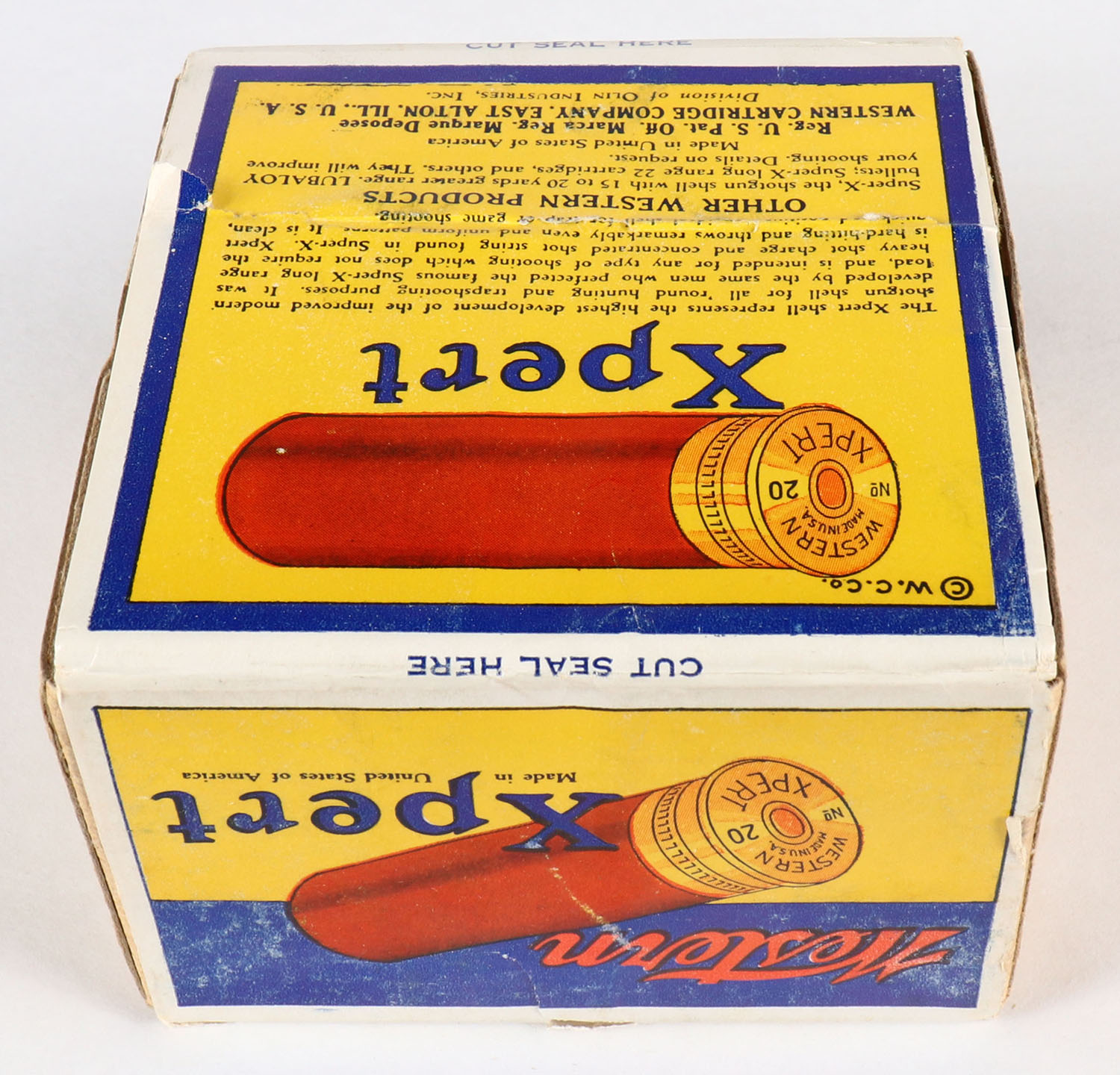 Western, Xpert, 20ga., 2pc., FULL and SEALED, shot size 7 1/2, buff box with blue and yellow paper label that pictures the pointer dog on top, box is very solid has light age soiling with great colors. Front of box says ''Shot and Powder Not Loaded In U.S.A'' but says ''Made In United States Of America'' on top of box, loaded in Mexico. Grade: Excellent ++ - Value: 50 to 200