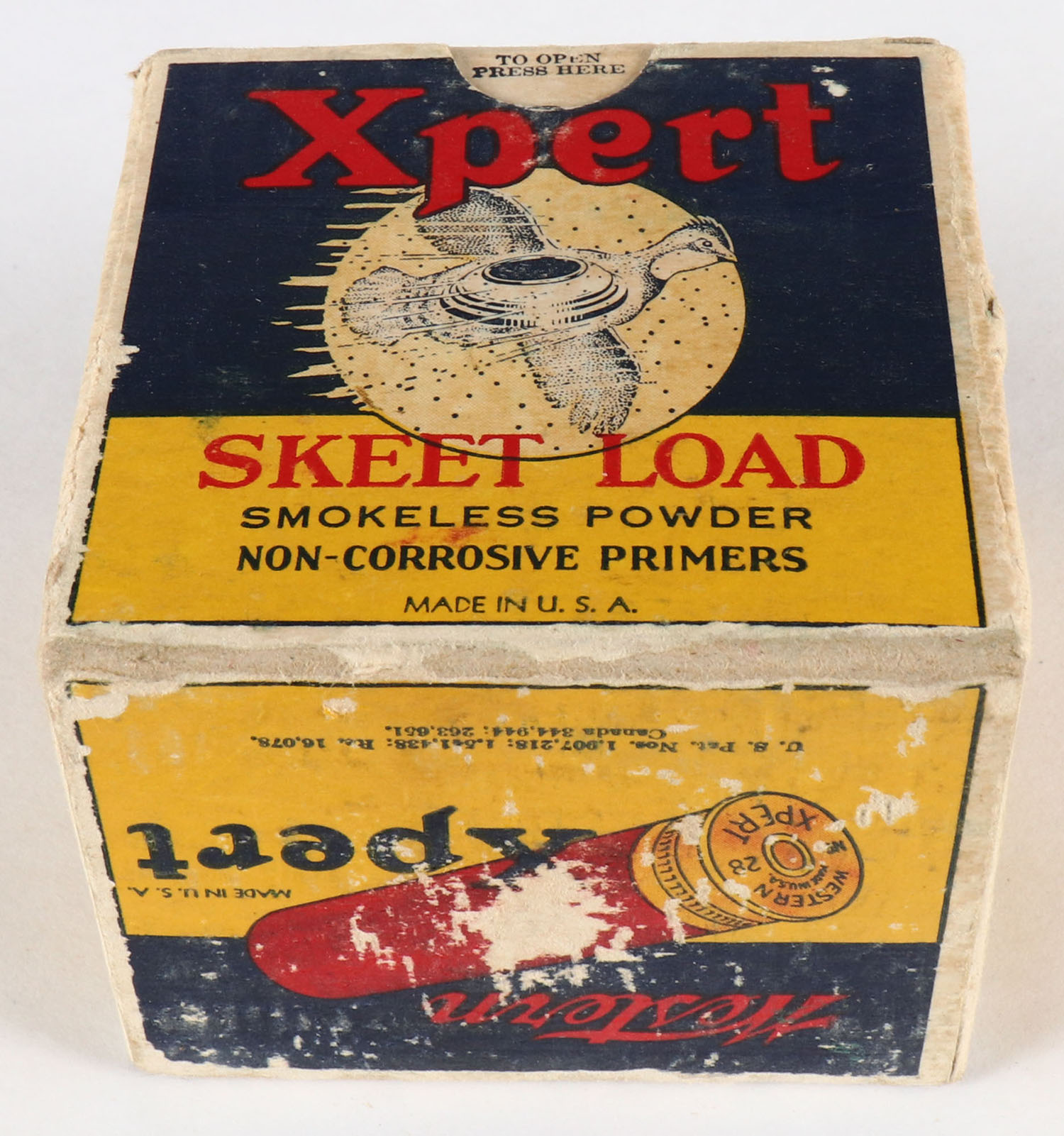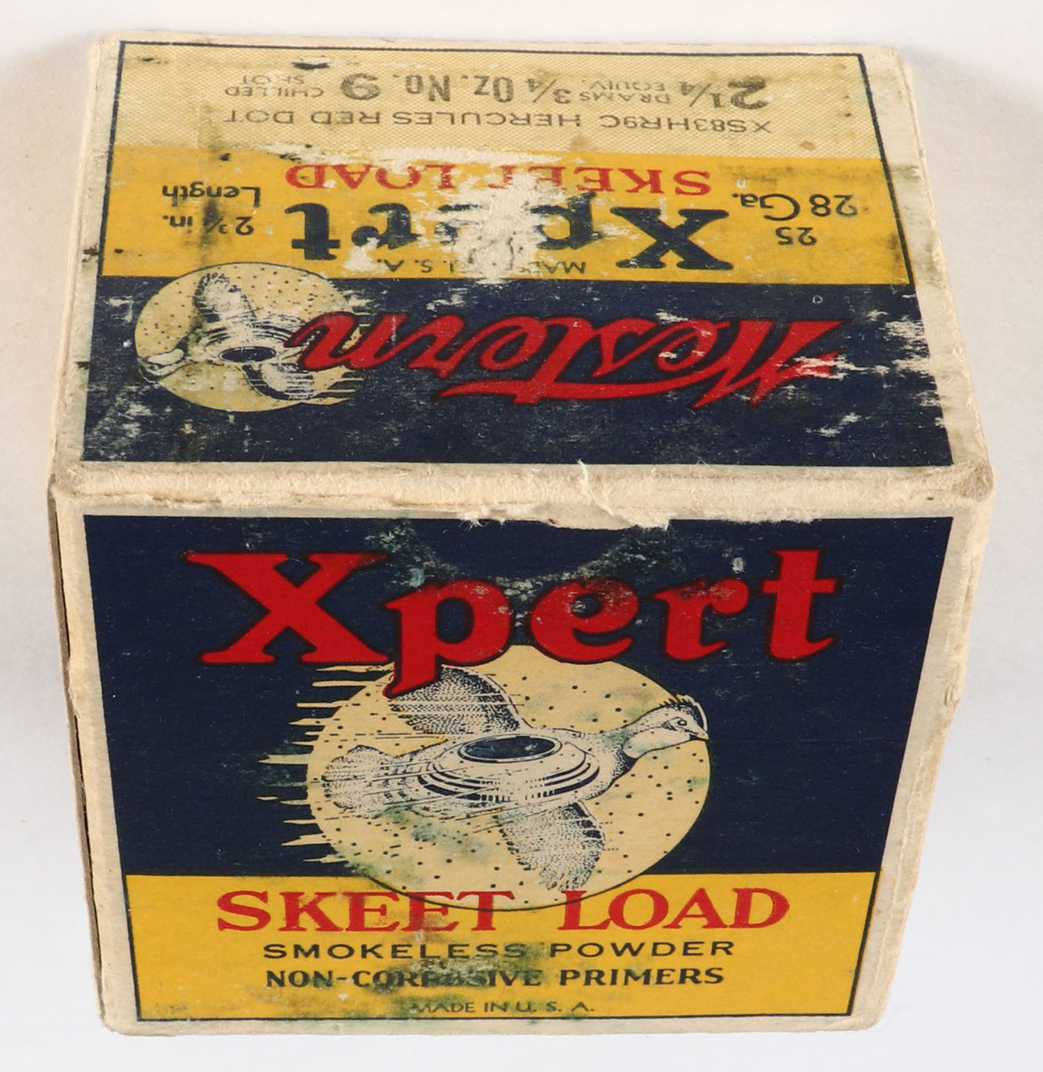 Western Xpert, SKEET LOAD, 28ga., 1pc., Full, white, blue & red box that pictures flying Quail with skeet in body & shot all around, Loading: 2 1/4 Drams 3/4 Oz. No. 9 Chilled Shot, box has scuffing with edge wear, paper shells are very good. Grade: Very Good ++ - Value: 100 to 400