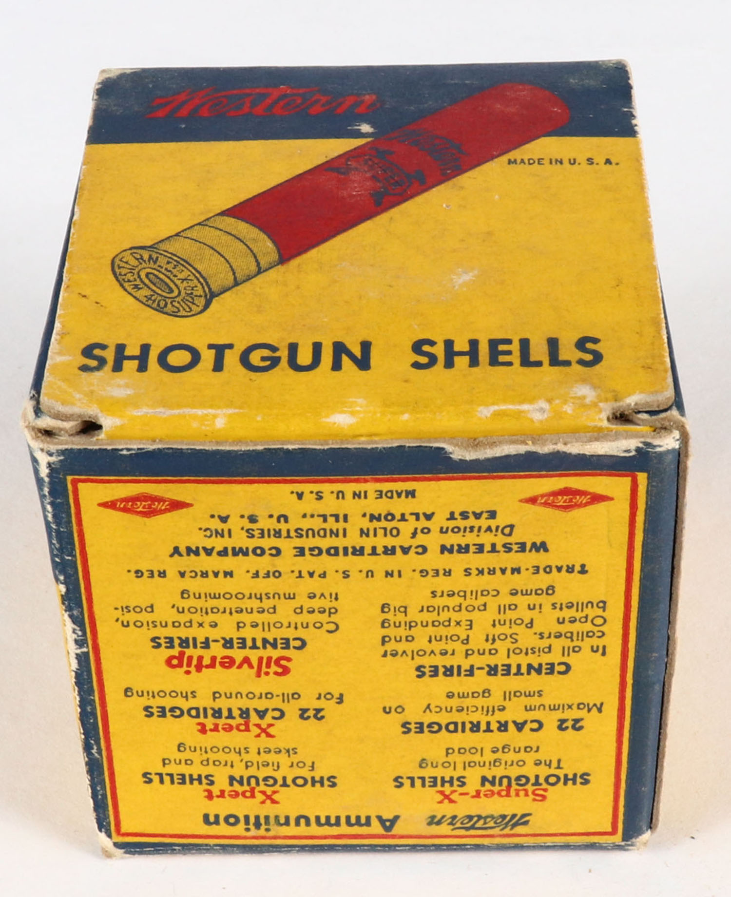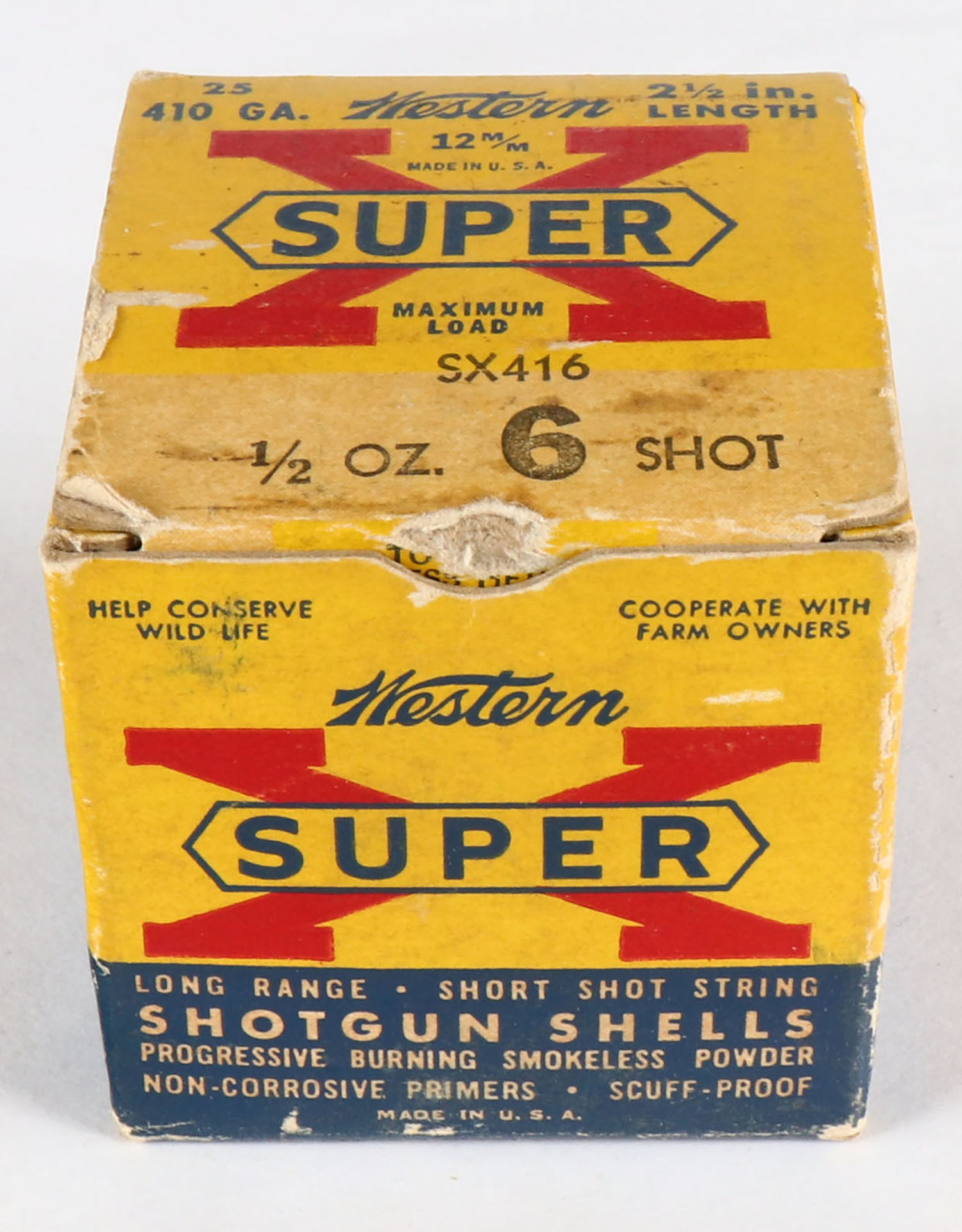 Western, Super X, 410ga., 2 1/2'', 1pc., Full, shot size 6, multi-colored box, box is solid with light age soiling, box has great colors, shells are very good. Grade: Very Good ++ - Value: 10 to 30
