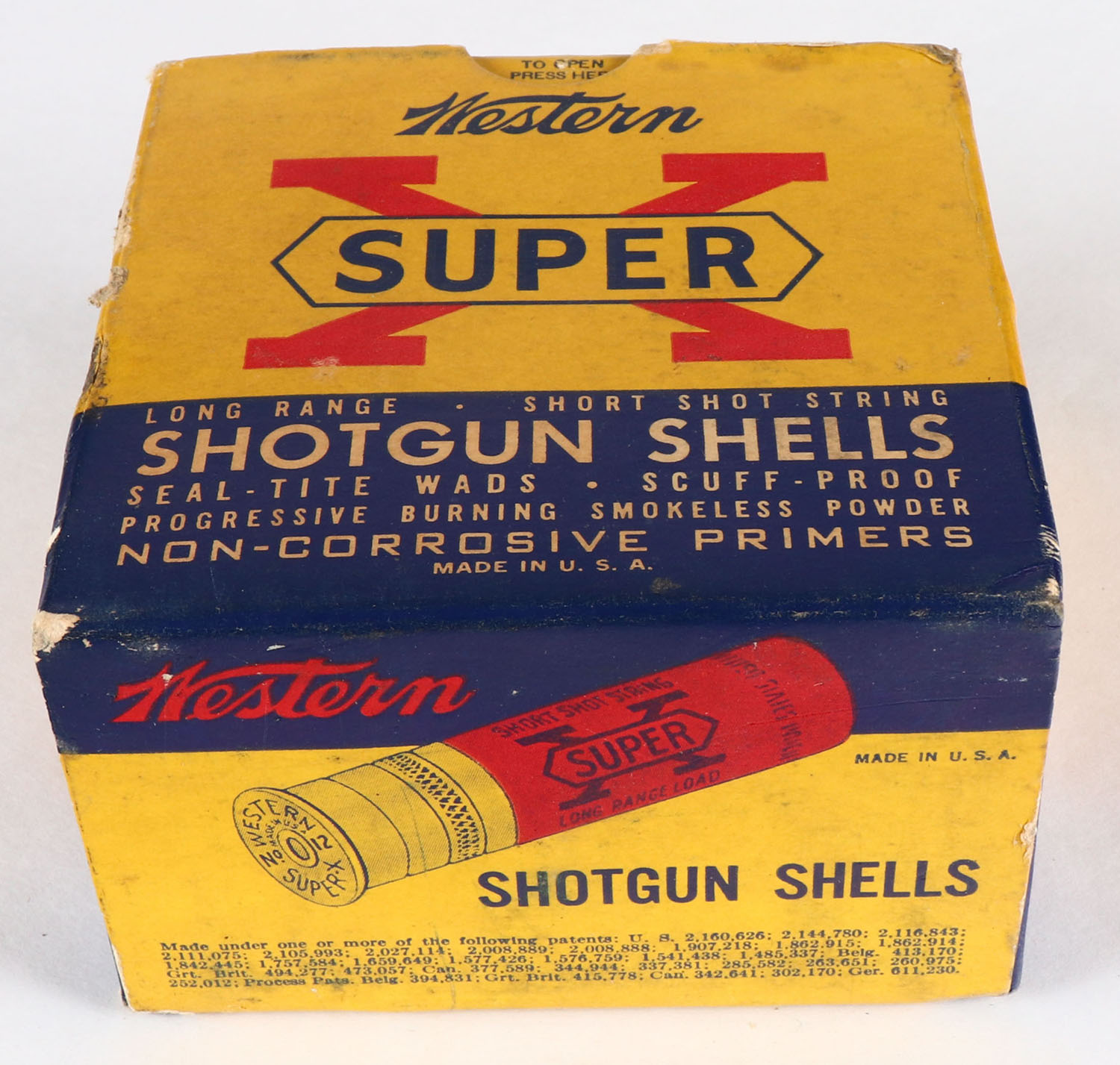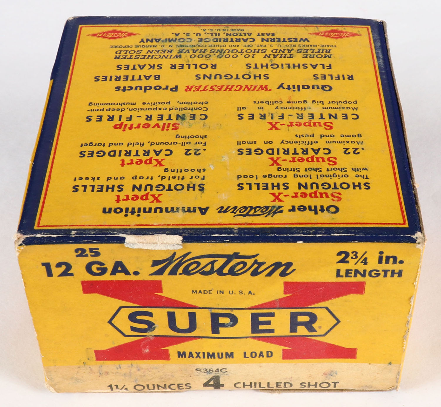 Western, Super X, 12ga., 2 3/4'', 1pc., Full, shot size 4 Chilled Shot, multi-colored box, box is solid with light scuffing & light edge wear, box has great colors, shells are excellent. Grade: Excellent - Value: 10 to 30