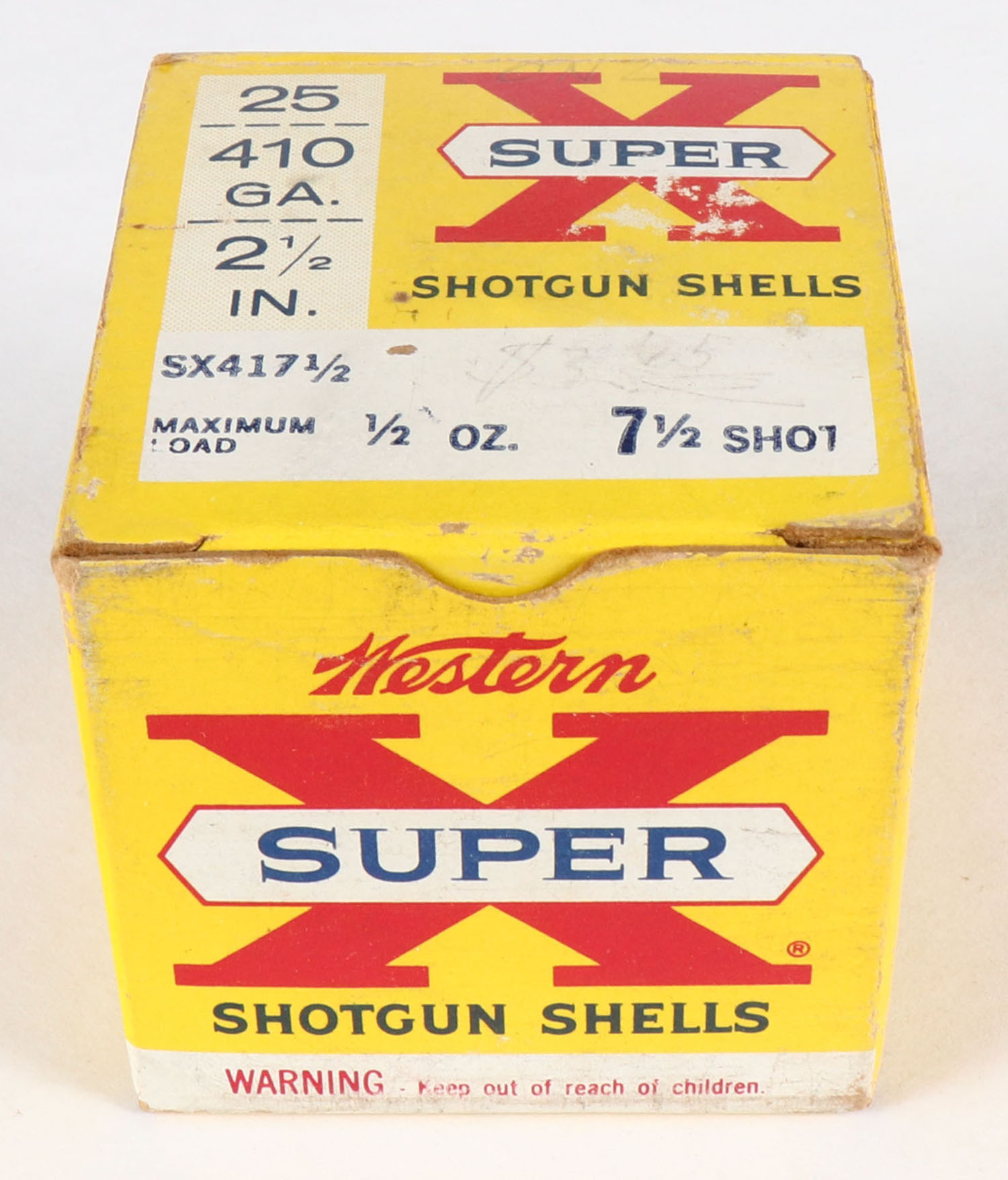 Western, Super X, 410ga., 2 1/2'', 1pc., Full, shot size 7 1/2, yellow, blue & red box, box is solid with light scuffing, box has great colors, shells are excellent. Grade: Very Good ++ - Value: 10 to 30