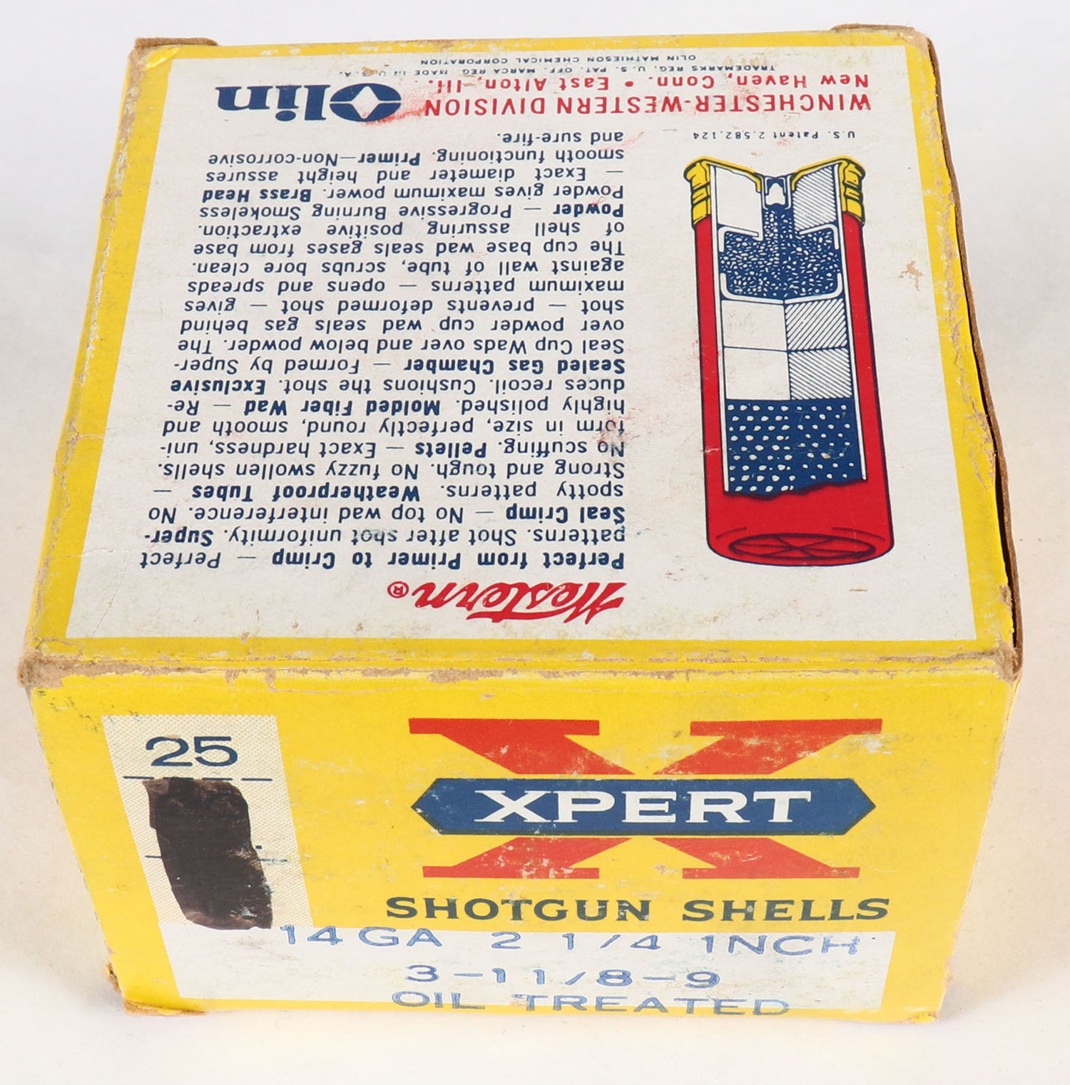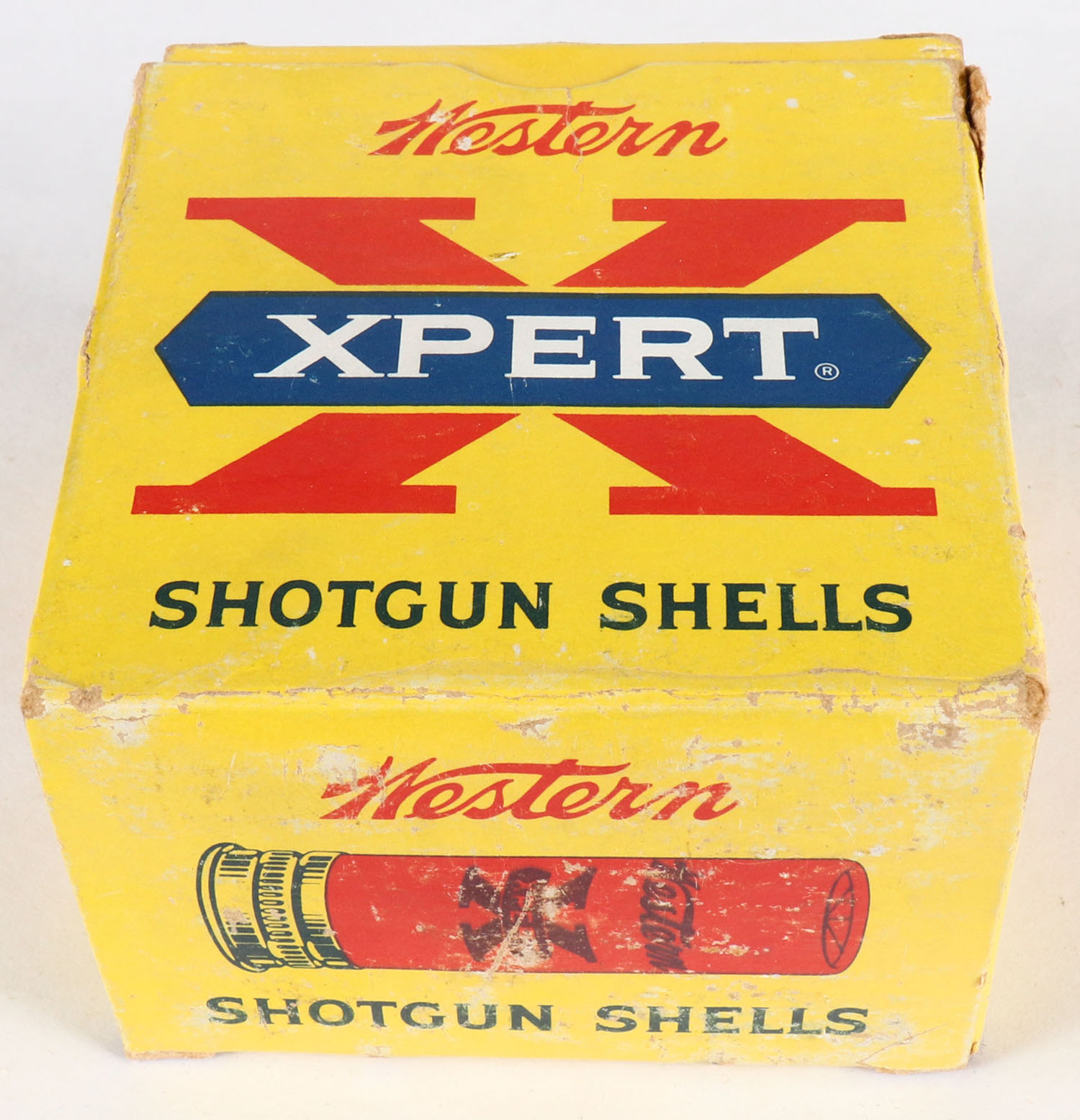 Western, Xpert, 14ga., 2 1/4'', Aluminum Shells, 1pc., Full, shot size 9, Oil Treated, yellow, blue & red box, box is solid with light scuffing, shells are excellent. Grade: Excellent - Value: 40 to 300