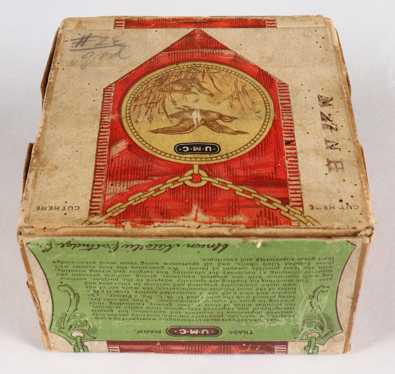 Remington UMC, New Club, 12ga, 2pc., Empty, shot size 2, buff box with multi color label, box has age soiling & scuffing with very nice color to label, box has light edge wear. Grade: Very Good ++ - Value: 20 to 80
