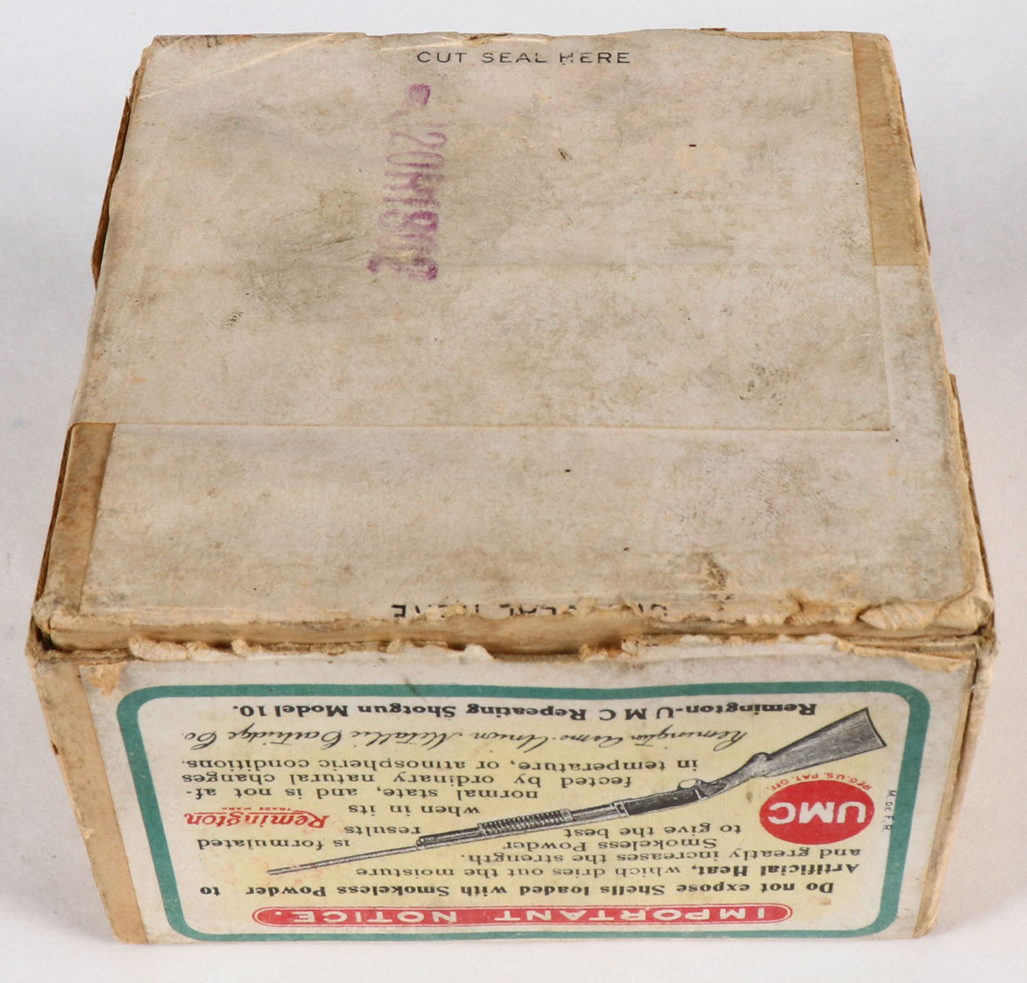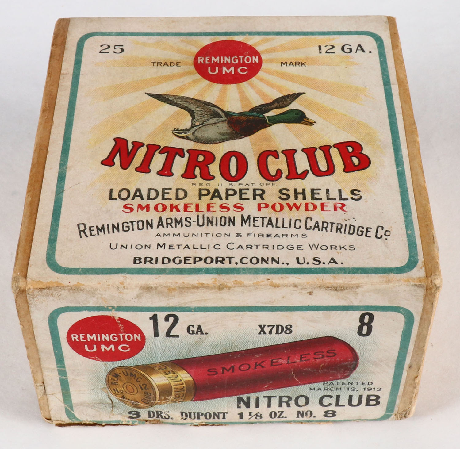 REM U.M.C. Nitro Club, 12ga., 2pc., Empty., shot size 8, buff box with sunburst logo & Mallard flying on top, box is very solid with nice colors, has light age soiling & scuffing. Grade: Very Good ++ - Value: 30 to 100