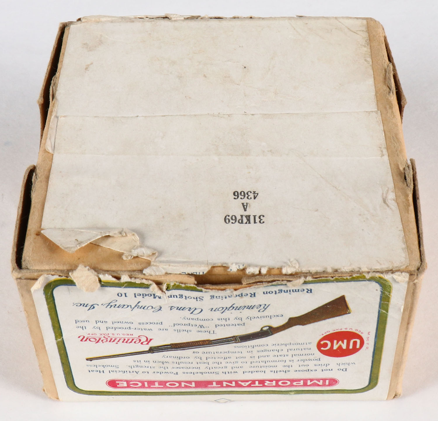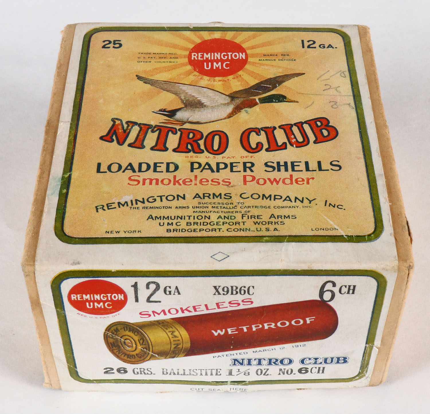 REM UMC, Nitro Club, 12ga., 2pc., Empty, shot size 6CH, buff box with sunburst logo & Mallard flying on top, box is solid with great colors, has light age soiling. Grade: Very Good ++ - Value: 20 to 80