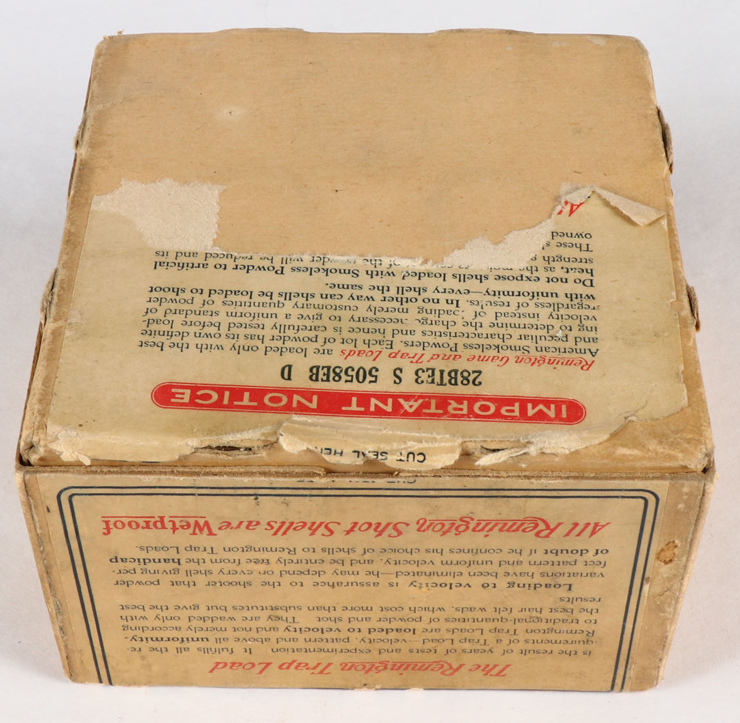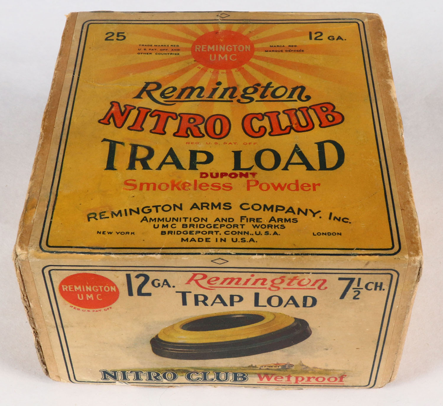 Remington UMC NITRO CLUB, Trap Load, 12ga., 2pc., Full, shot size 7 1/2 CH., buff box with multi-colored label & sunburst logo, box has scuffing with light age soiling, paper shells are excellent. Grade: Very Good ++ - Value: 100 to 500