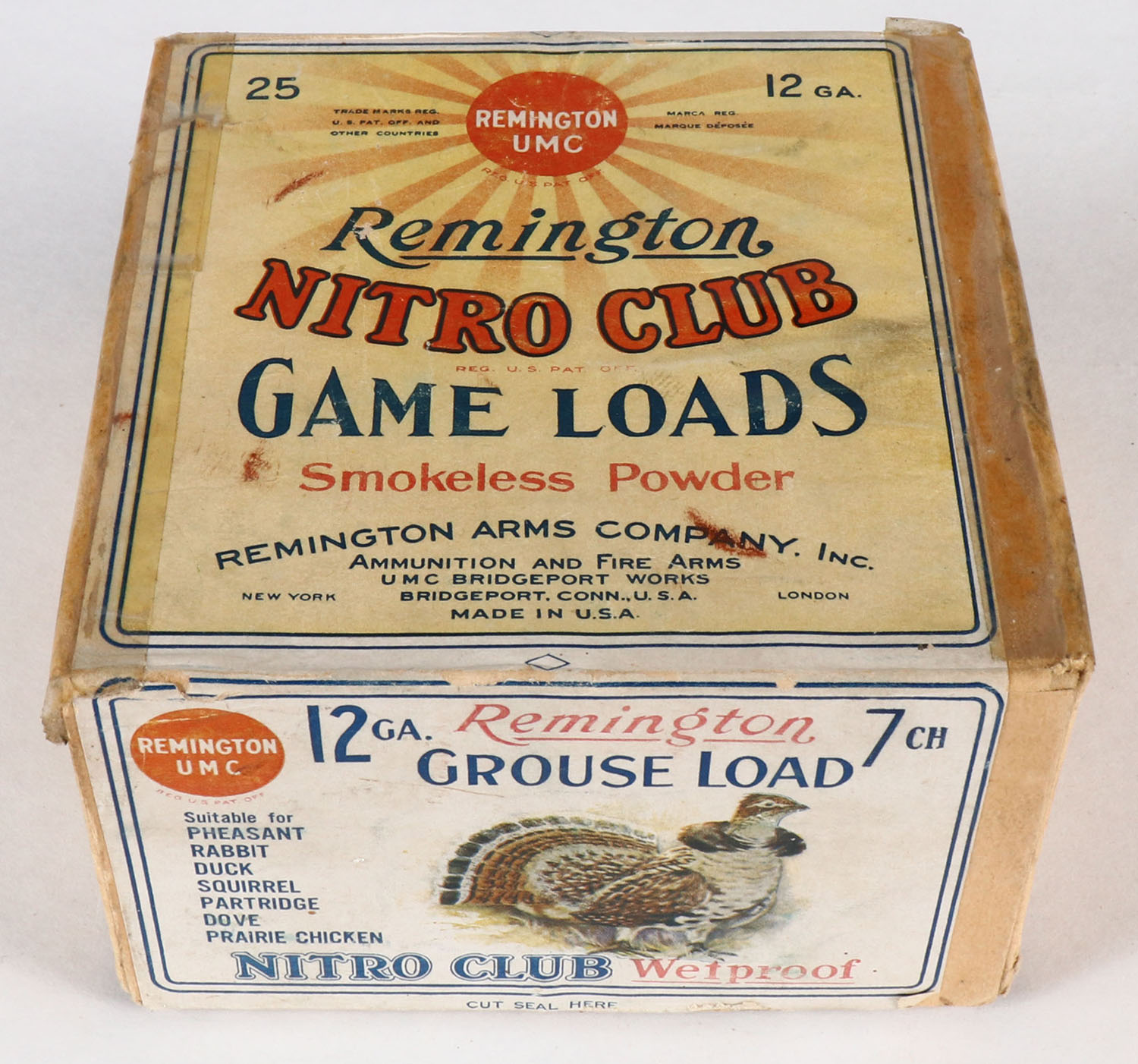 Remington UMC Nitro Club, GAME LOADS, GROUSE LOAD, 12ga., 2pc., Partial 3rds., shot size 7CH., buff box with sunburst logo & Ruffed GROUSE on side, box has tape repairs to seams, scuffing and light age soiling, paper shells are excellent. Grade: Very Good + - Value: 100 to 400