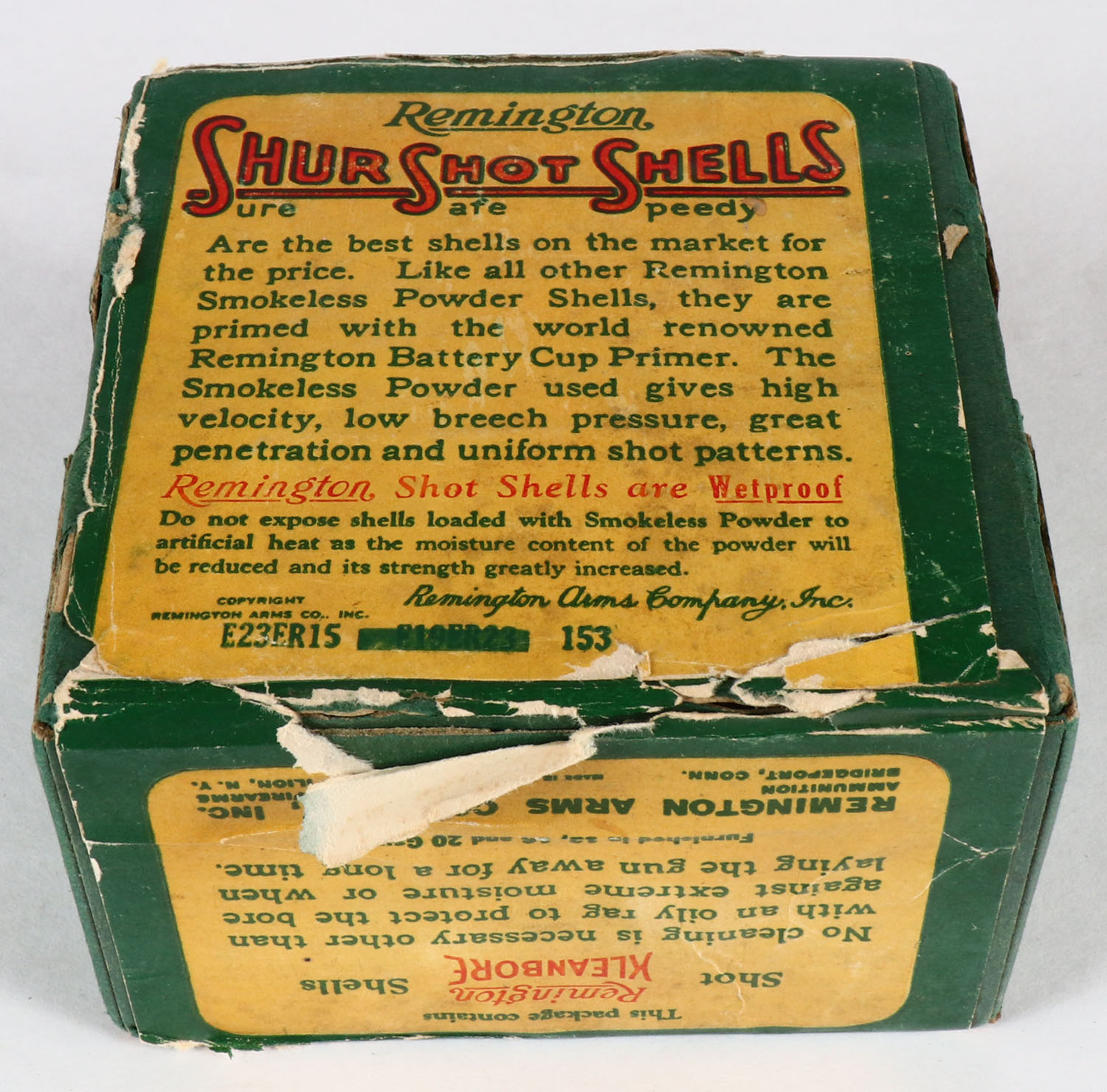 Remington UMC, Shur Shot Shells, TARGET LOAD, 12ga., 2pc., FULL & SEALED, shot size 7 1/2 CH, green box with green, yellow & red paper label, box has edge wear & light soiling, has light shell protrusions to bottom. Grade: Very Good ++ - Value: 100 to 300
