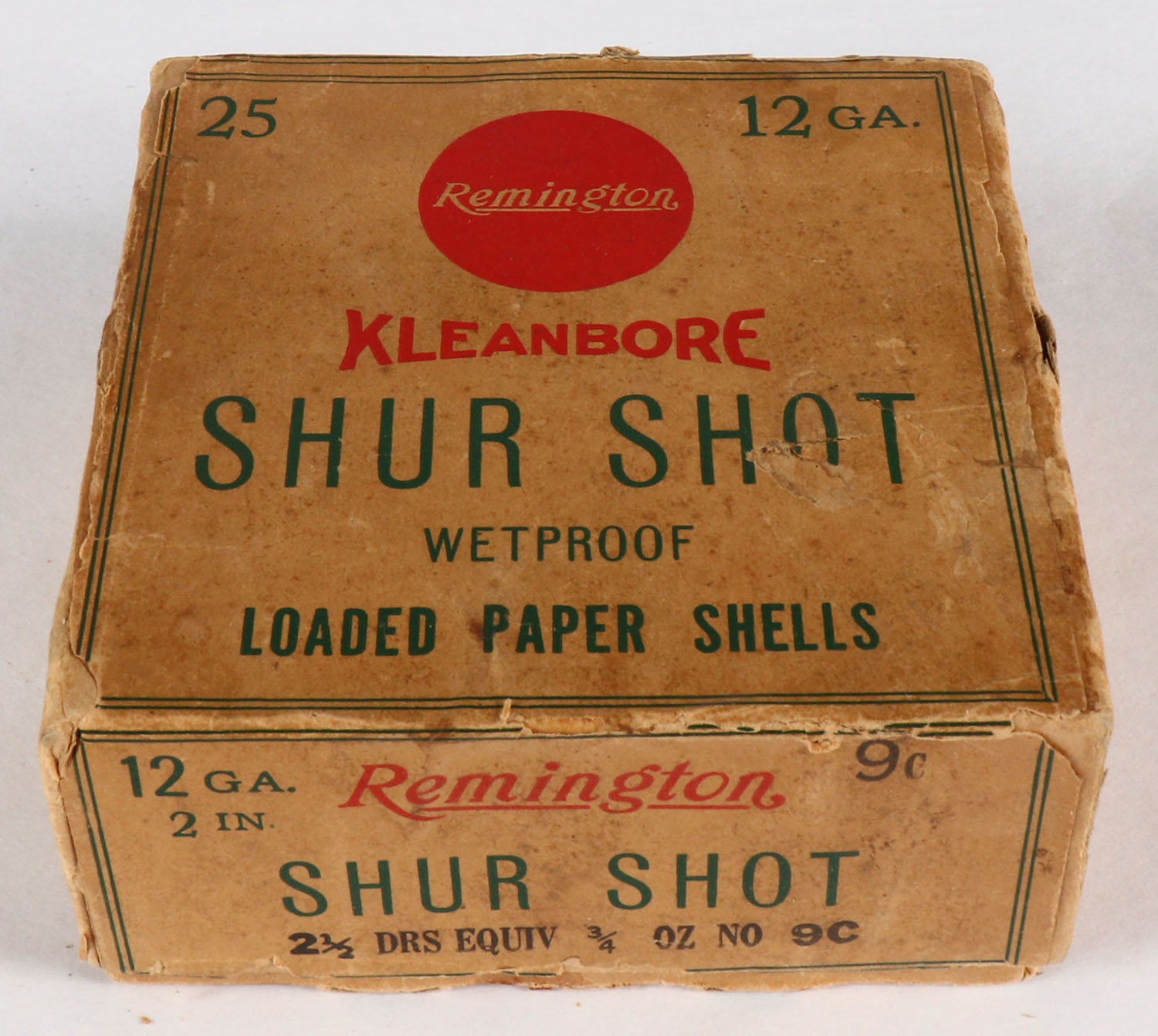 Remington, SHUR SHOT, 12ga., 2'', 2pc., Full, shot size 9 C, Buff box with buff, green & red paper label, box has scuffing & edge wear with shell protrusion, shells are very good. Grade: Very Good - Value: 60 to 200