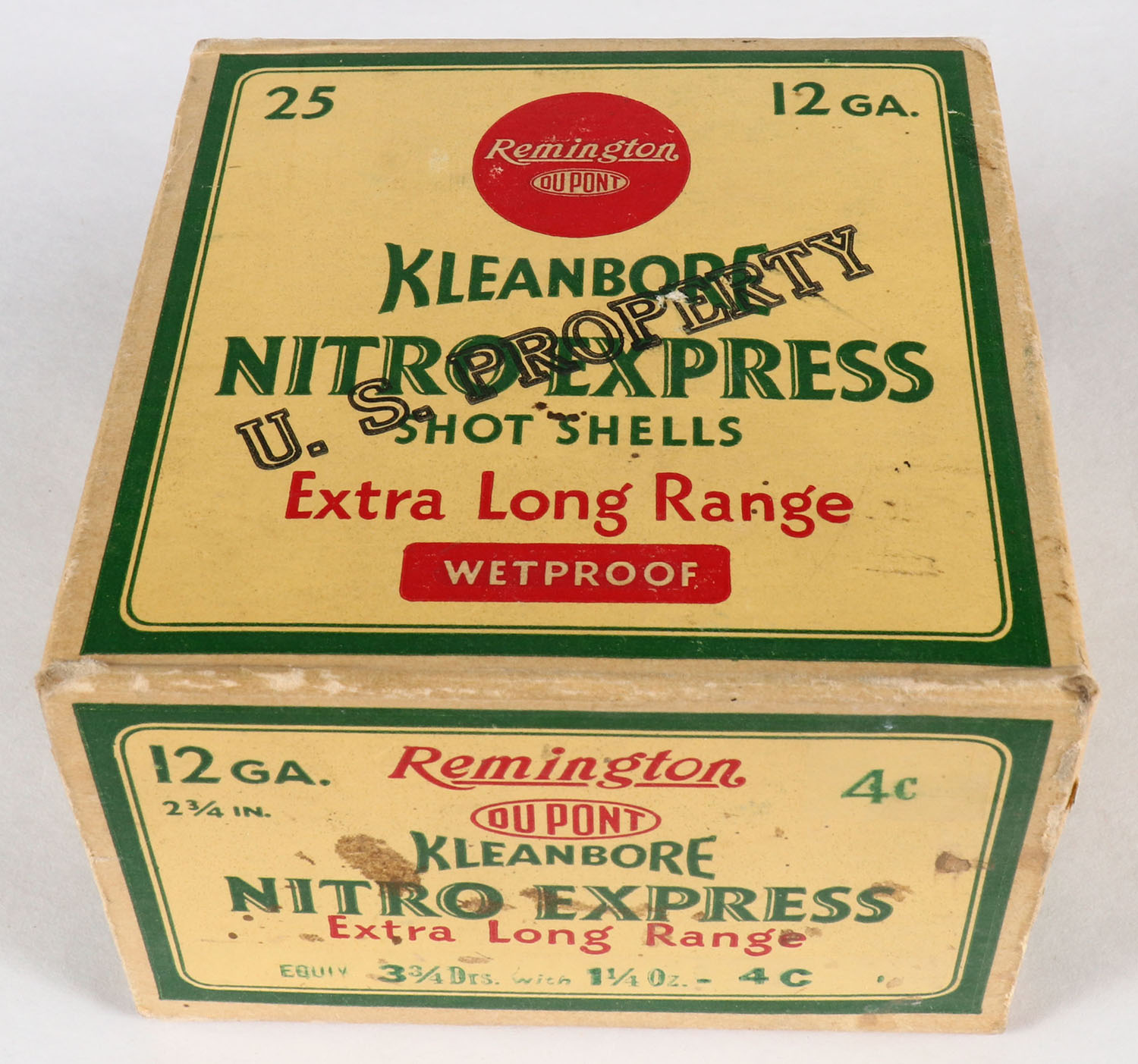 Remington, Kleanbore, NITRO EXPRESS, U.S. Property, 12ga., 2 3/4'', 1pc., Full, shot size 4C, box is buff, yellow, red and green, box is very solid with very nice colors, shells are very good. Grade: Very Good ++ - Value: 20 to 60