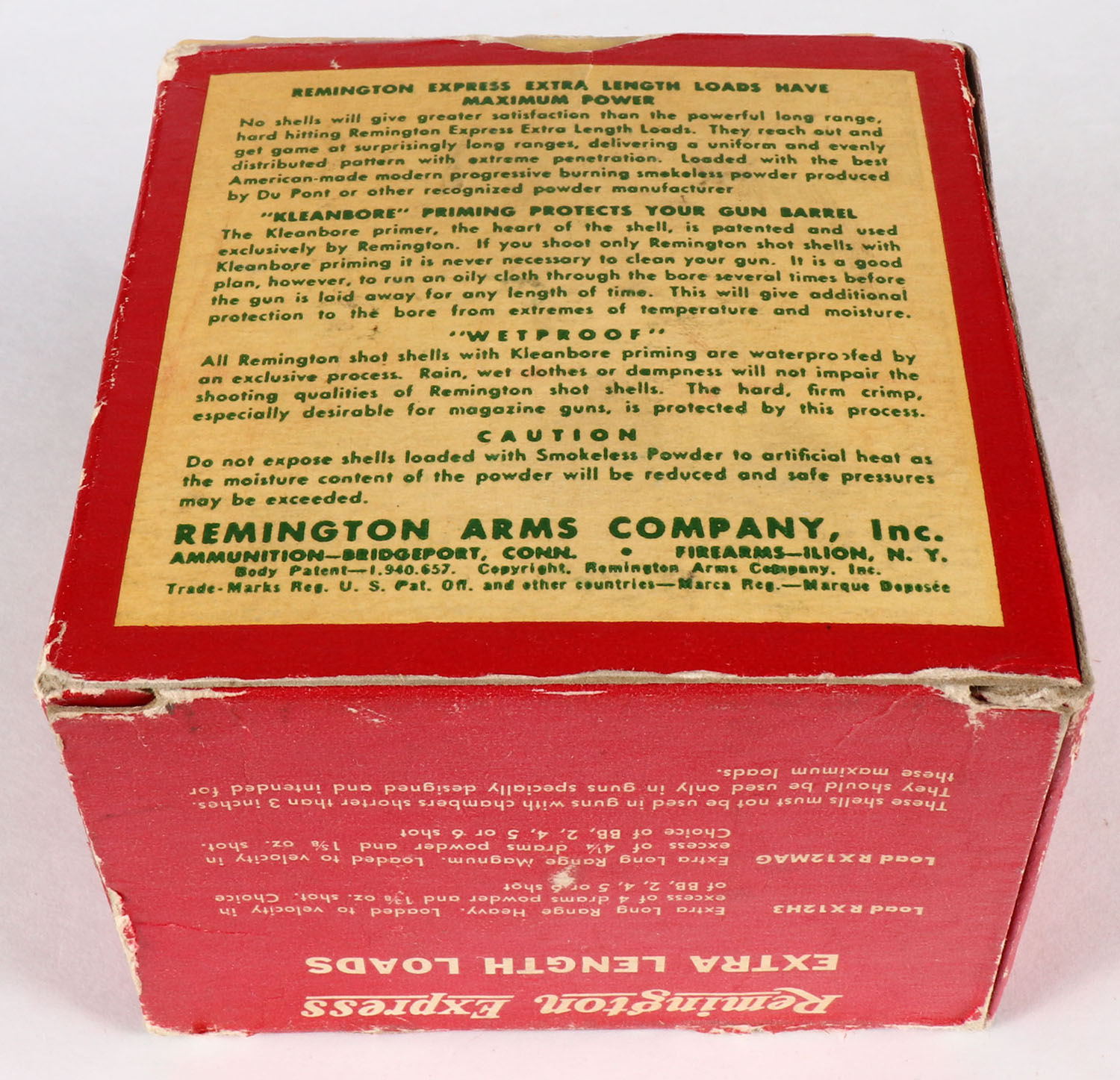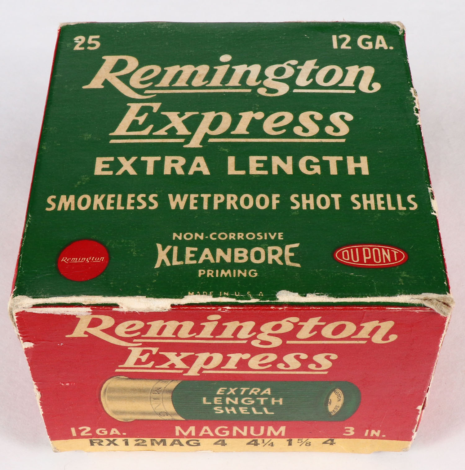 Remington Express, Extra Length, Magnum, 12ga., 1pc., Partial 17rds., shot size 4, 3'', red, white and green box, box is solid with very nice colors, has edge wear, shells are excellent. Grade: Very Good ++ - Value: 10 to 40
