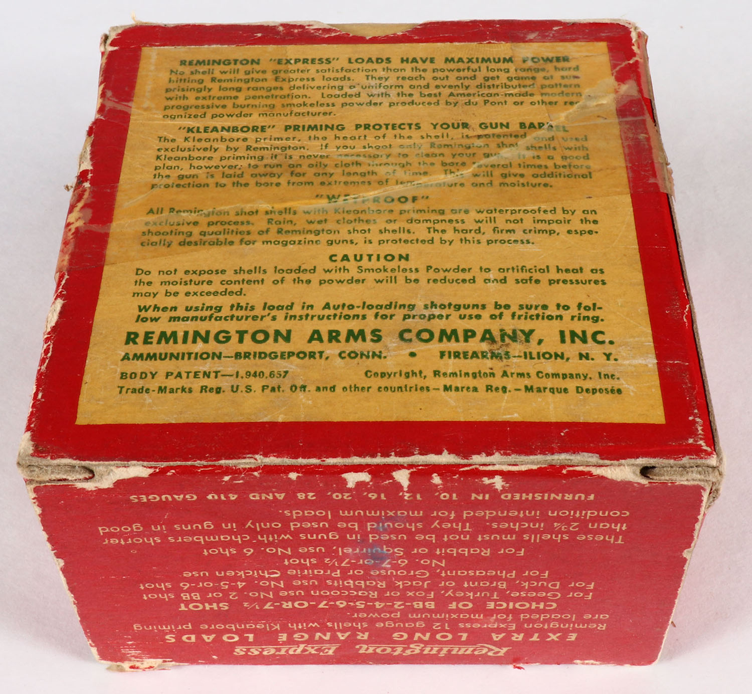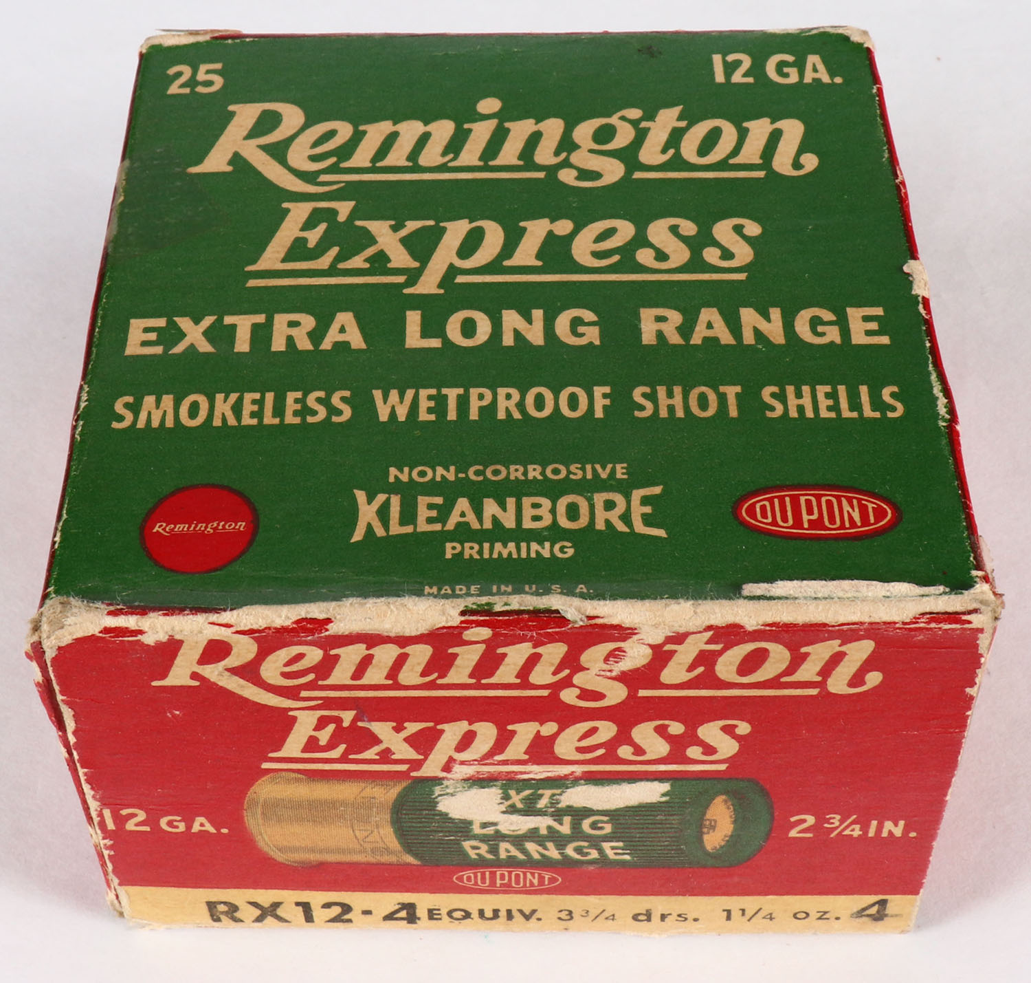 Remington Express, Extra Long Range, 12ga., 2 3/4'', 1pc., Full, shot size 4, box is red, white and green, box has edge wear with tape repairs, shells are excellent. Grade: Very Good ++ - Value: 10 to 30