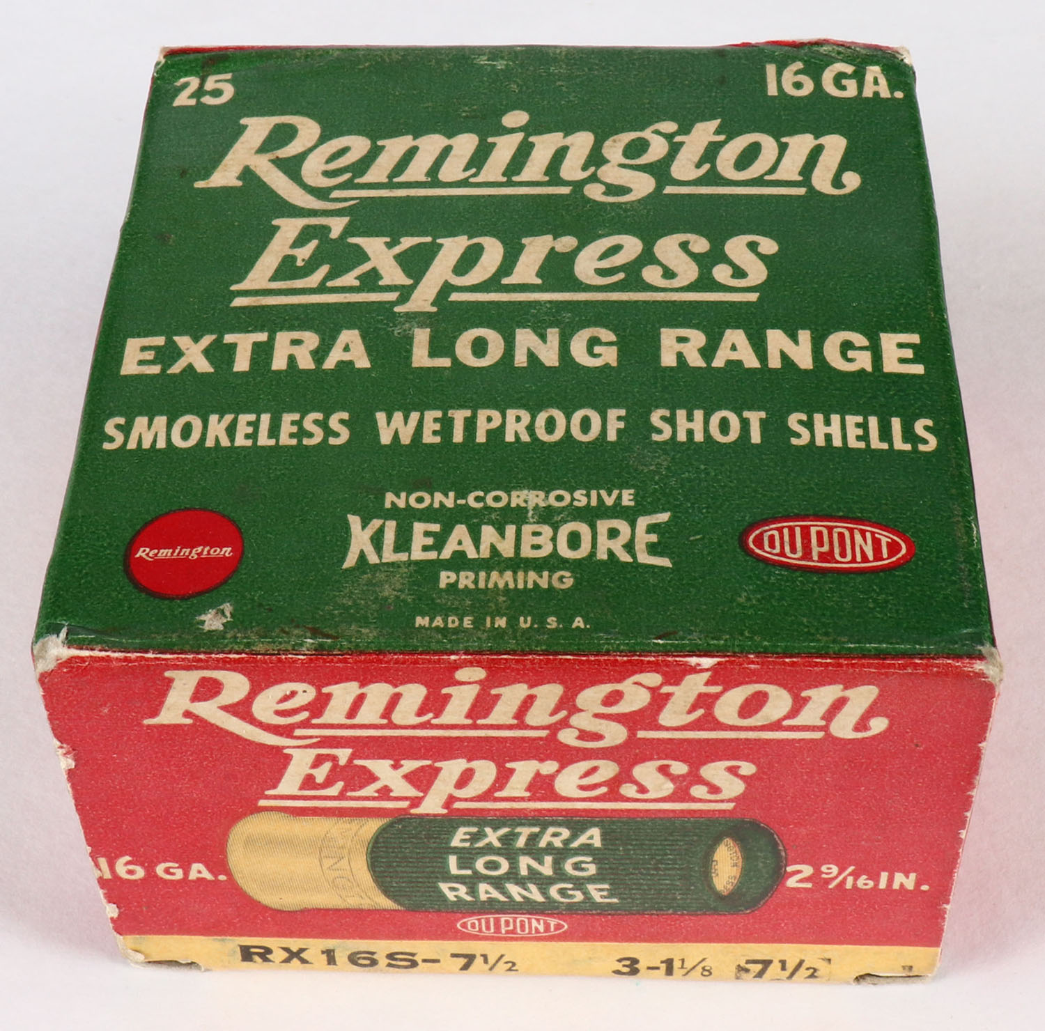 Remington Express, Extra Long Range, 16ga., 1pc., Full, shot size 7 1/2, 2 9/16'', red, white and green box, box is solid with light edge wear, shells are very good. Grade: Very Good ++ - Value: 10 to 30