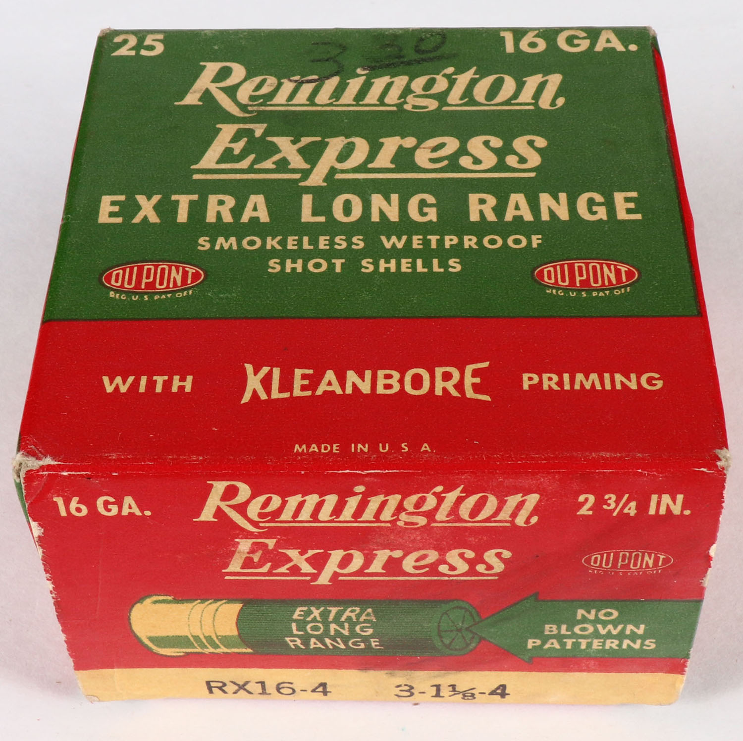 Remington Express, Extra Long Range, 16ga., 2 3/4'', 1pc., Full, shot size 4, box is red, green, and yellow, box is very solid, plastic shells are excellent. Grade: Excellent - Value: 10 to 30