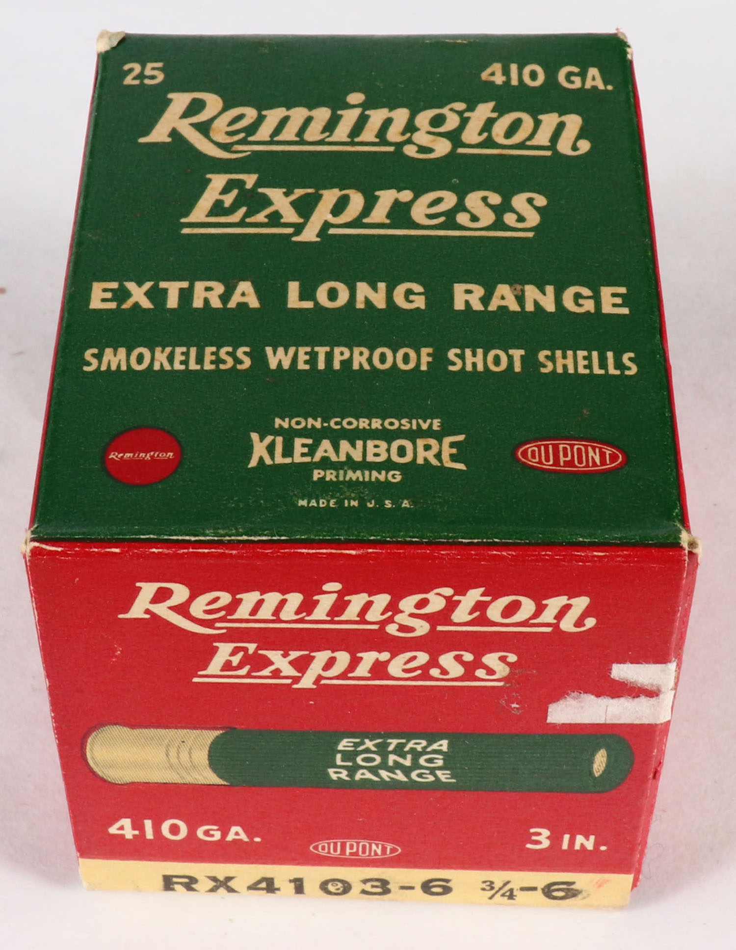 Remington Express, Extra Long Range, 410ga., 3'', 1pc., Full, shot size 6, box is white, yellow, red and green, box is very solid with excellent colors, shells are excellent. Grade: Excellent ++ - Value: 10 to 50