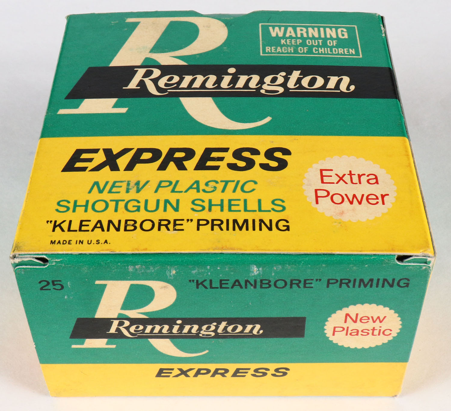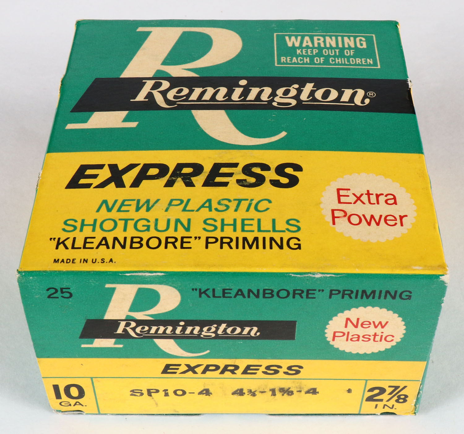 Remington, Express, 10ga., 2 7/8'', 1pc., Full, shot size 4, multi-colored box, box is very solid with great colors, plastic shells are excellent. Grade: Excellent + - Value: 20 to 100