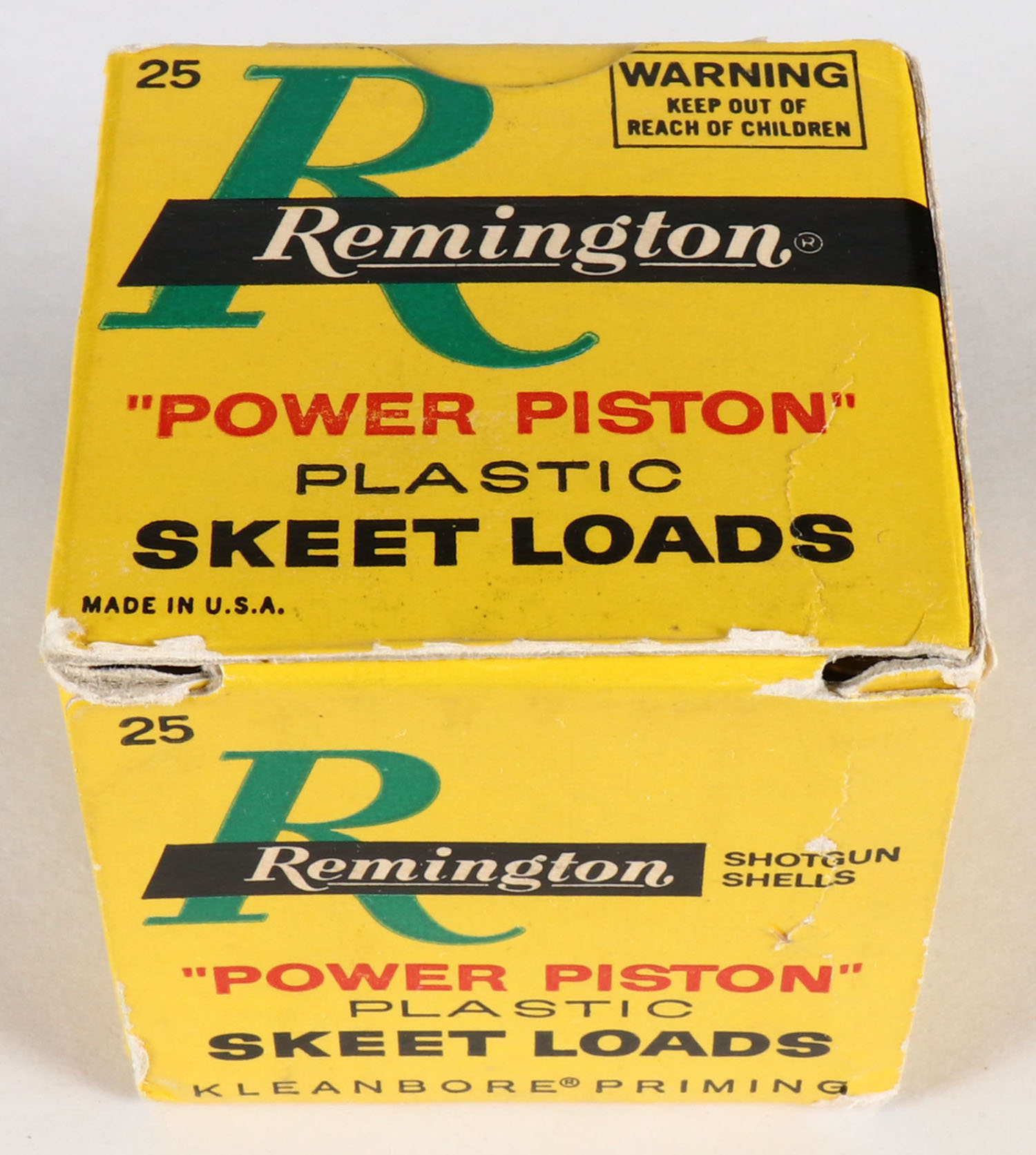 Remington, Skeet Loads, ''Power Piston'', 410ga., 2 1/2'', 1pc., Full, shot size 9, yellow, black & green box, box is very solid, plastic shells are very good. Grade: Very Good ++ - Value: 10 to 40