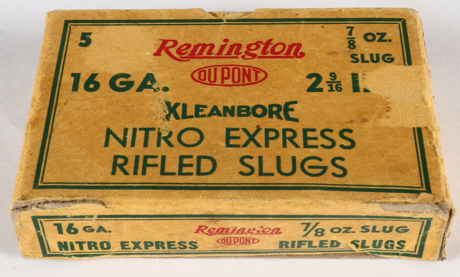 Remington, Kleanbore, NITRO EXPRESS, 16ga., 1pc., Full, shot size Rifled Slugs, box is buff, red and green, box has scuffing, paper shells are very good. Grade: Very Good - Value: 10 to 30