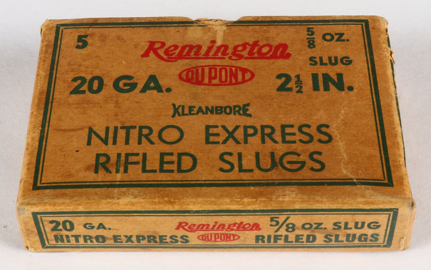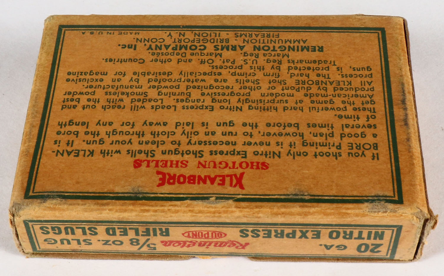 Remington, Kleanbore, NITRO EXPRESS, 20ga., 2 1/2'', 1pc., Full, shot size Rifled Slugs, box is buff, red and green, box is solid with scuffing, paper shells are good. Grade: Very Good - Value: 10 to 30