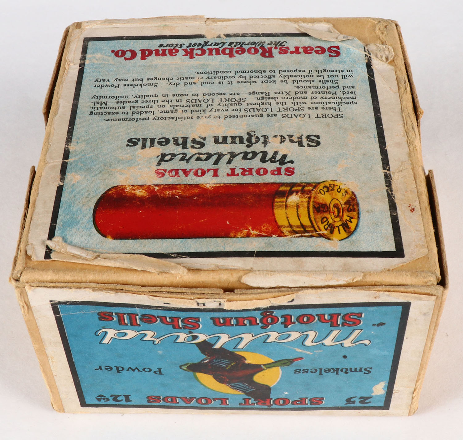 Sears Roebuck & Co., Sports Loads MALLARD, 12ga., 2pc., Partial 14rds., shot size 5 Ch, buff box with multi colored label that pictures a Mallard flying with a yellow moon in background, box has light age soiling with scuffing, paper shells are excellent. Grade: Very Good ++ - Value: 60 to 300
