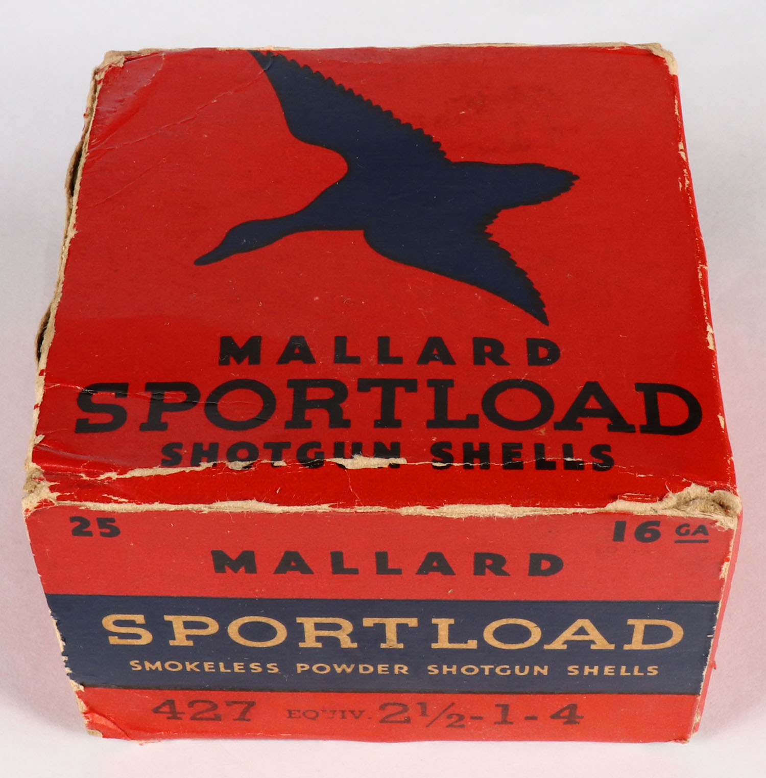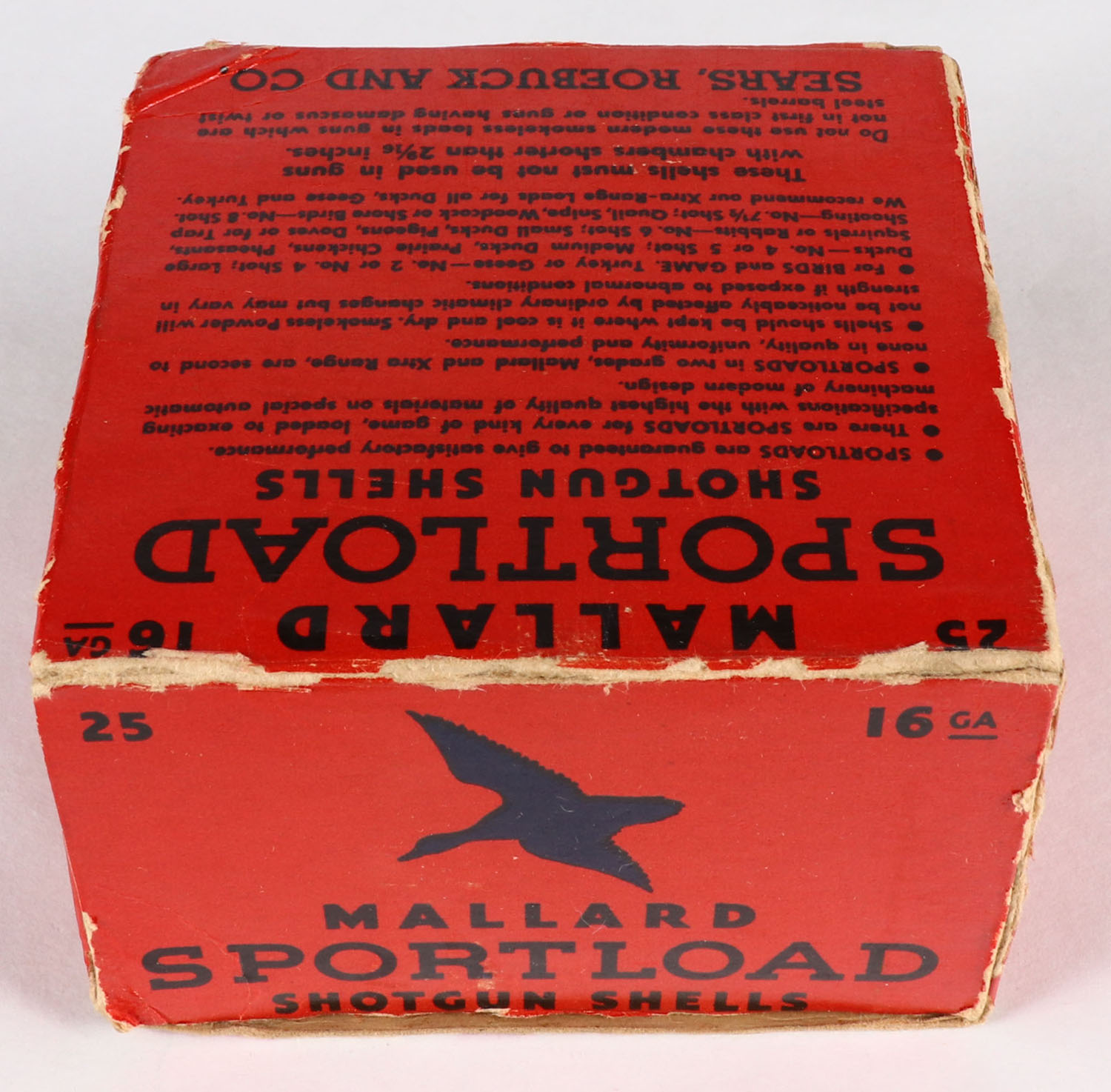 Sears, Sportload MALLARD, 16ga., 1pc., Full, shot size 4, red & blue box that pictures a Mallard in flight, box has a seam split with edge wear, paper shells are excellent. Grade: Very Good - Value: 40 to 100