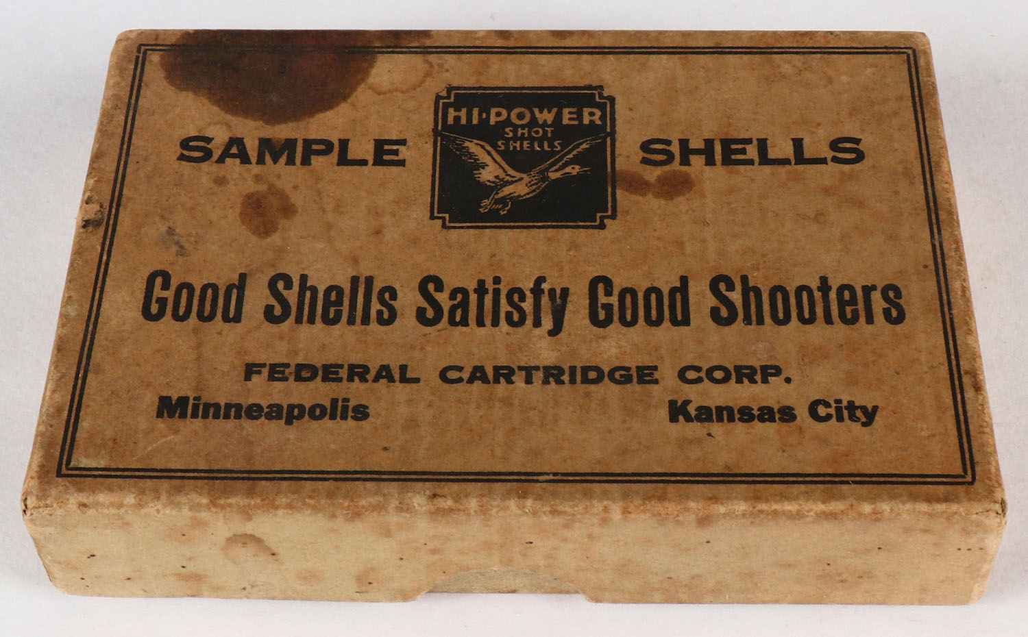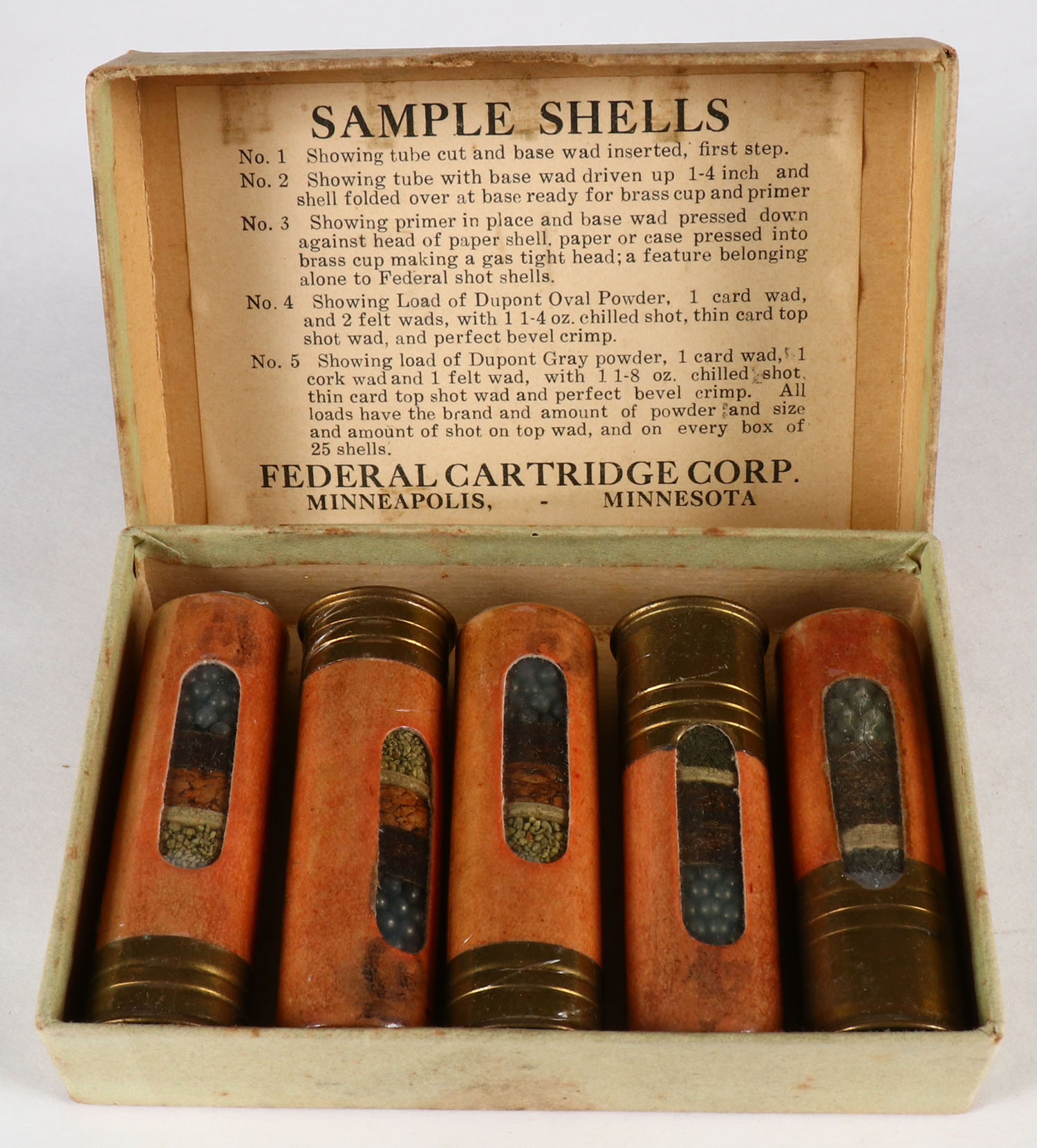 Federal, Hi-Power 5 pc salesman sample set in green box, ''SAMPLE SHELLS'' on front with flying mallard logo, shows 5 steps of shotshell loading (we have one step four, three step fives, and one window shell unmarked), box has age soiling, the five shells are excellent. Grade: Very Good + - Value: 50 to 100