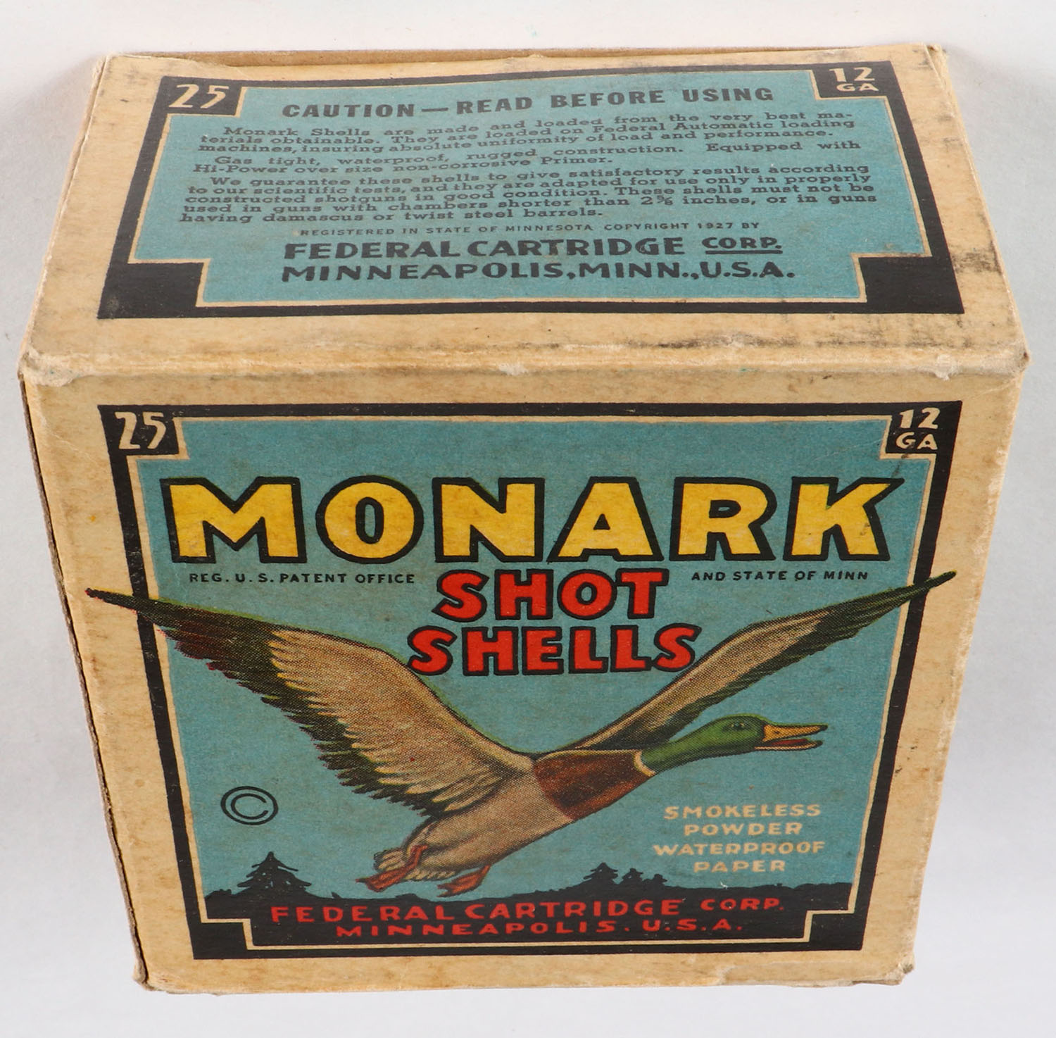 Federal Cart. Co., MONARK, 12ga., 1pc., Partial 20rds., shot size 6, Black border, blue, yellow and red box with flying mallard, box has light age soiling & scuffing, paper shells are very good. Grade: Very Good ++ - Value: 10 to 40
