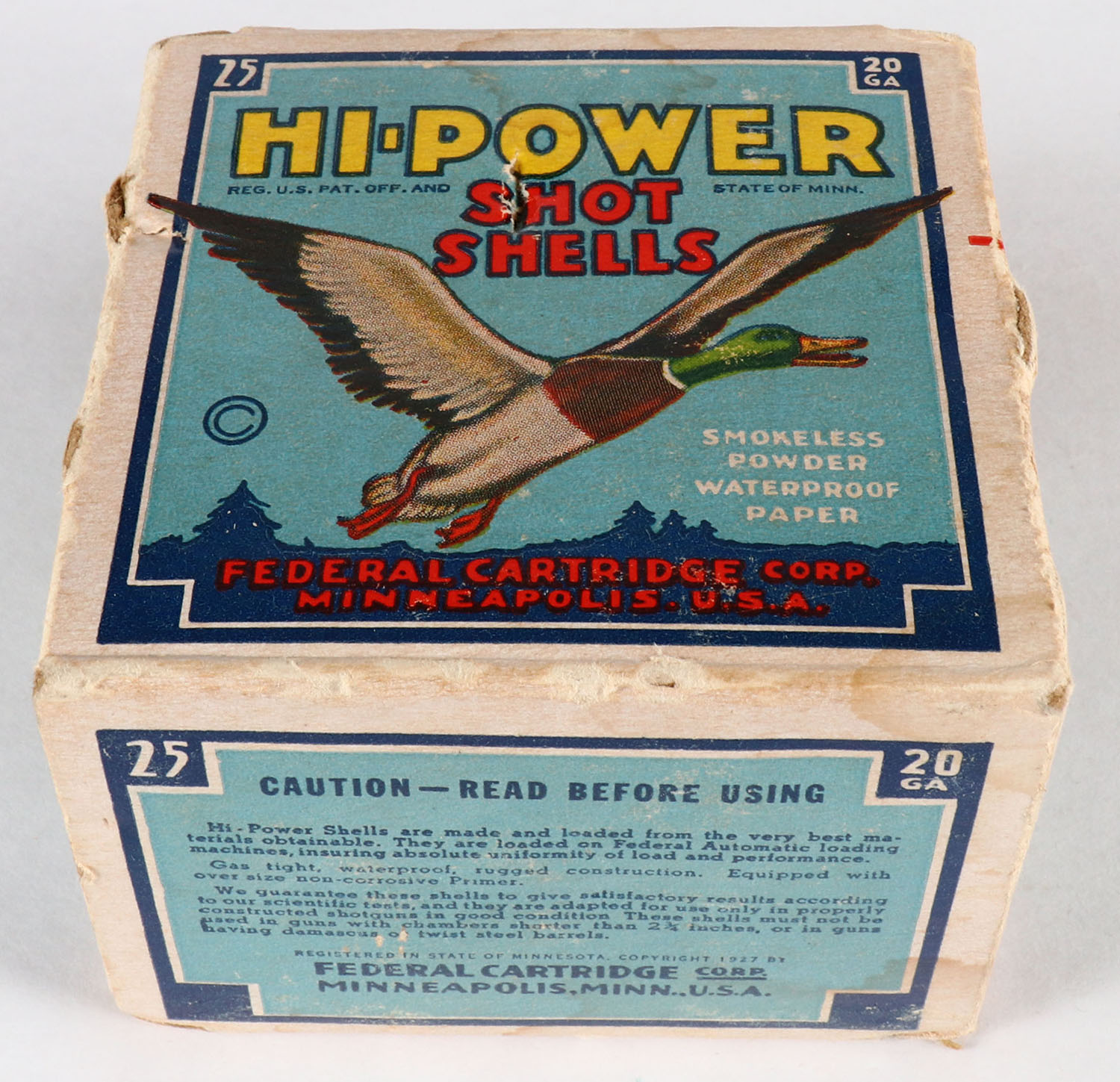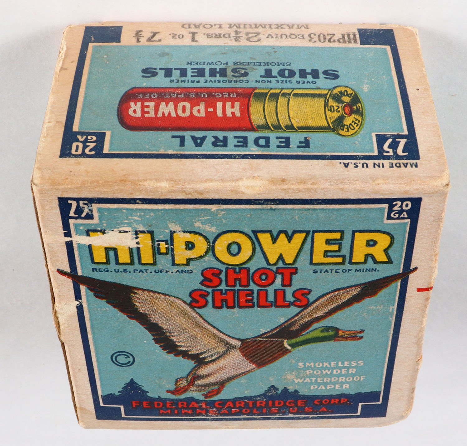 Federal Cart. Co., HI-POWER, 20ga., 1pc., Full, shot size 7 1/2, Blue border, blue, yellow and red box with flying mallard, box has light soiling with very nice colors, has light shell protrusion, paper shells are very good. Grade: Very Good + - Value: 10 to 50