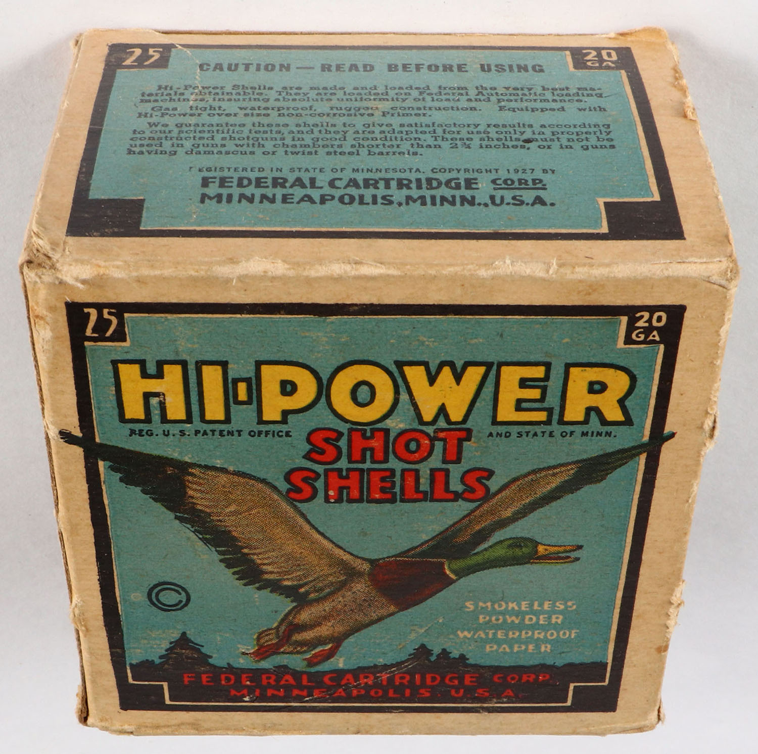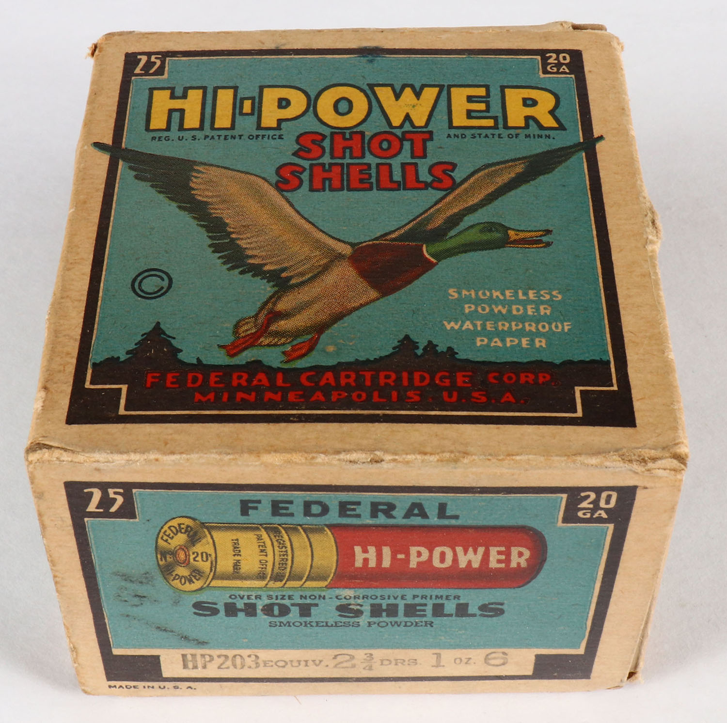 Federal Cart. Co., HI-POWER, 20ga., 1pc., Full, shot size 6, Black border, blue, yellow and red box with flying mallard, box has scuffing with edge wear, paper shells are excellent. Grade: Very Good ++ - Value: 10 to 50