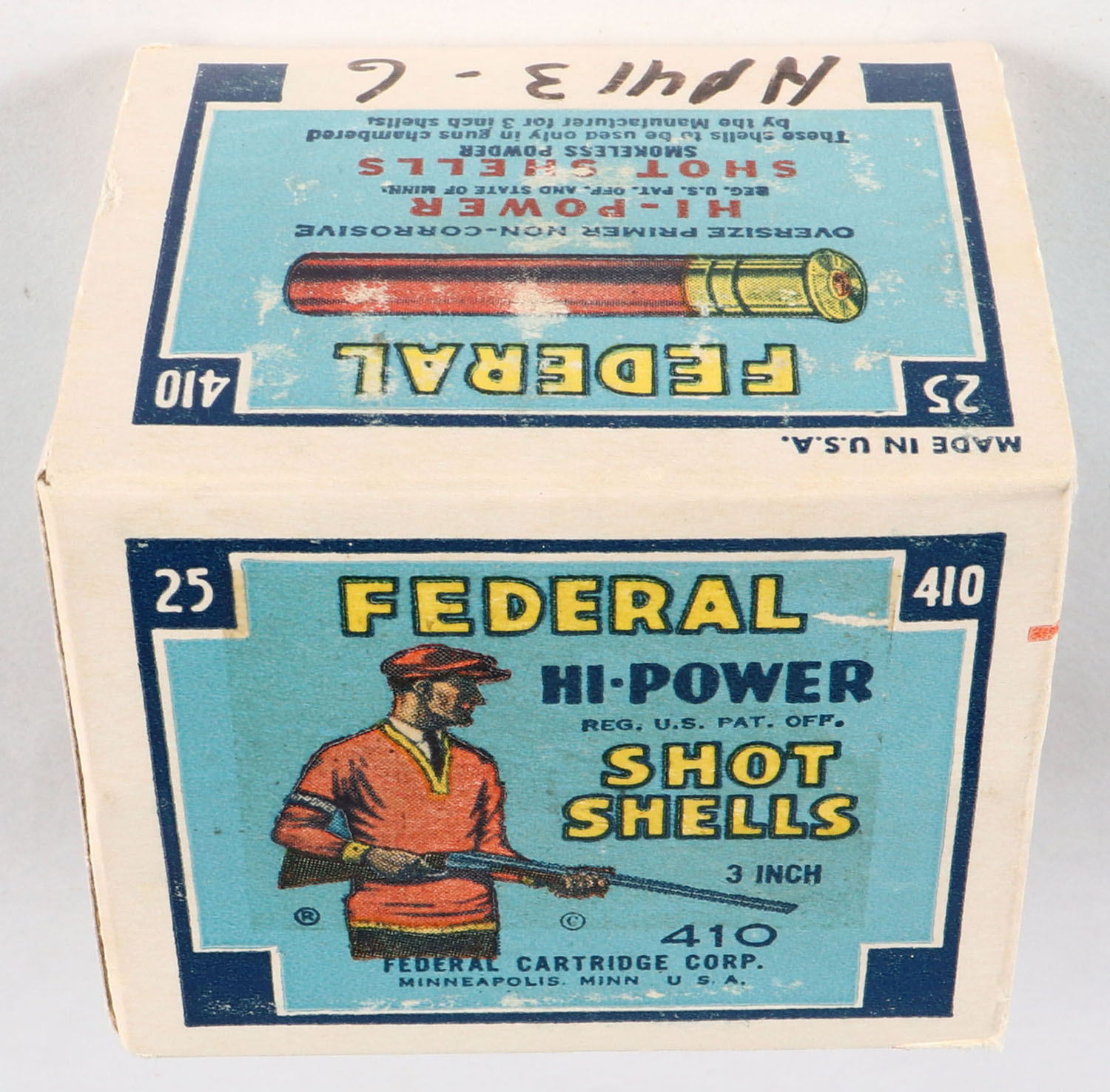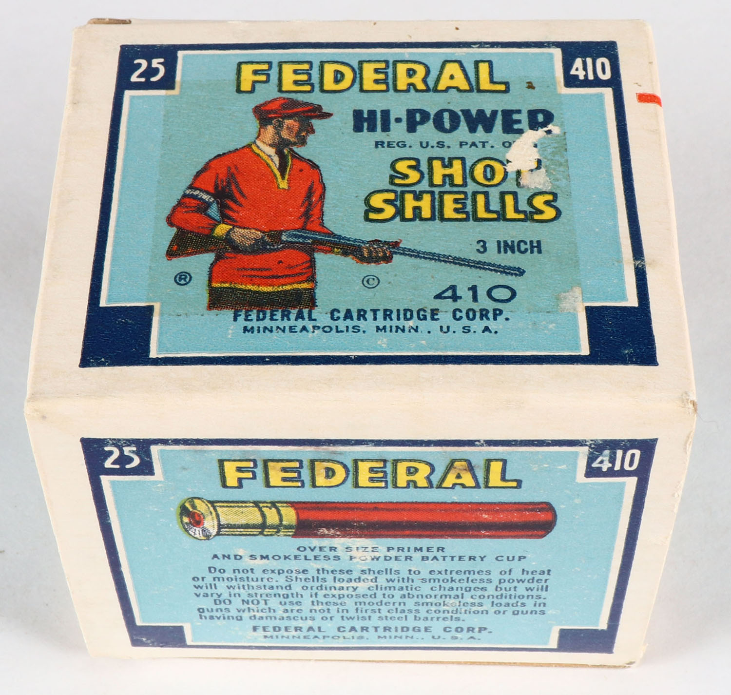 Federal Cart. Co., HI-POWER, 410ga., 3'', 1pc., Full, shot size 6, Blue border, blue, yellow and red box with Trap Shooter, box has very light scuffing with great colors, paper shells are excellent. Grade: Excellent - Value: 40 to 200