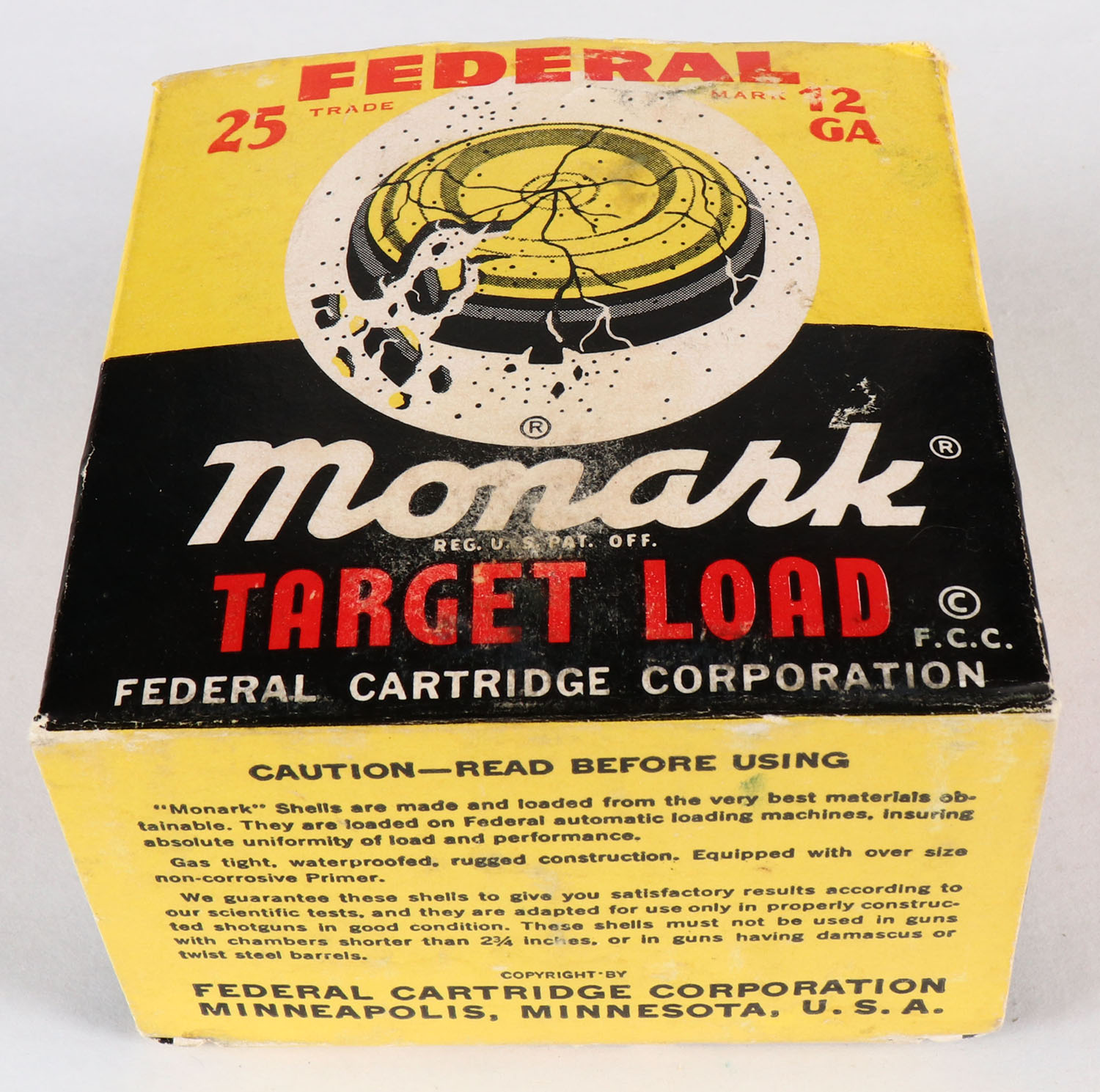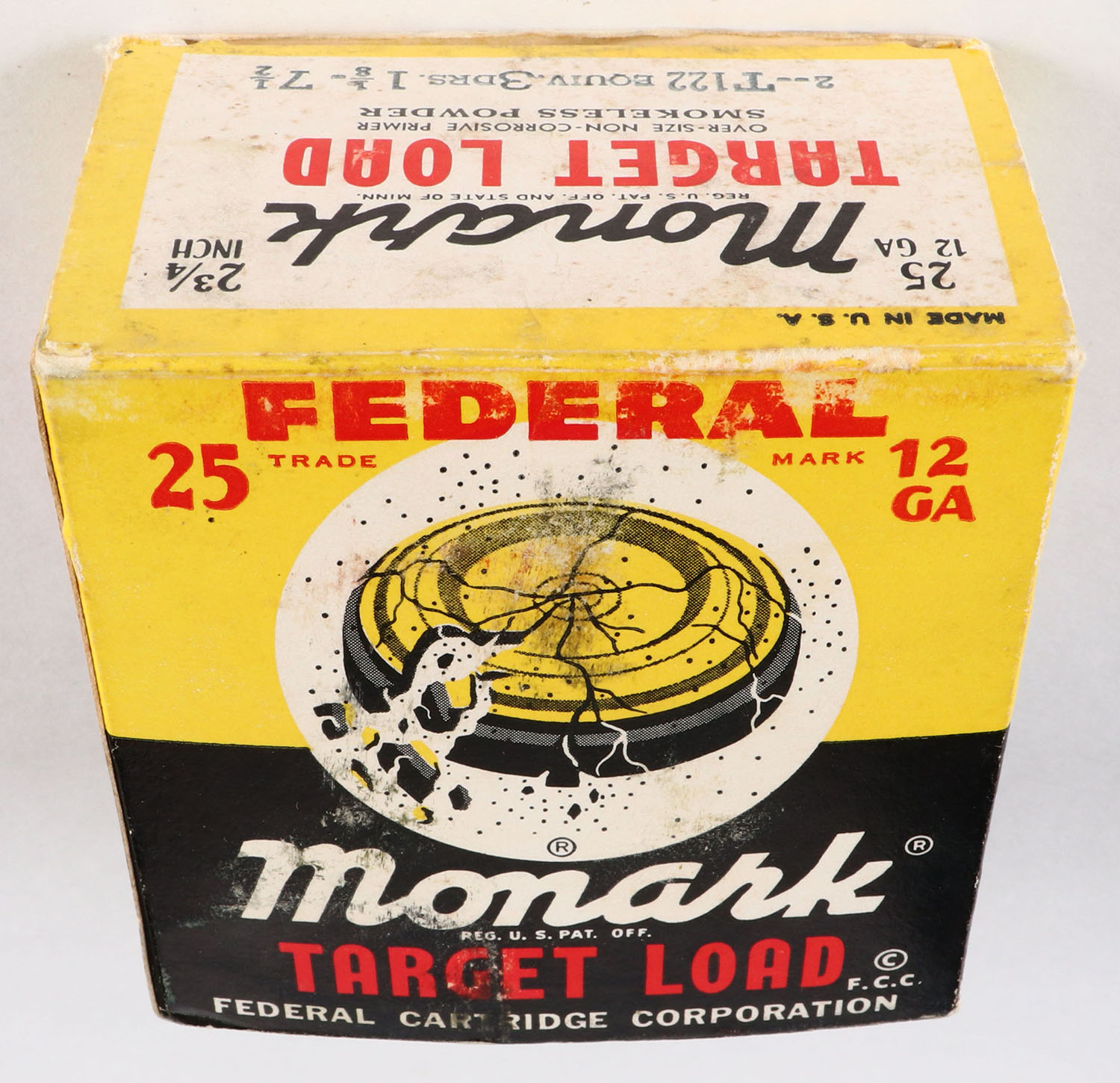 Federal, Monark, Target Load, 12ga., 1pc., Partial 14rds., shot size 7 1/2, box has scuffing with very nice colors, paper shells are excellent. Grade: Very Good ++ - Value: 8 to 30