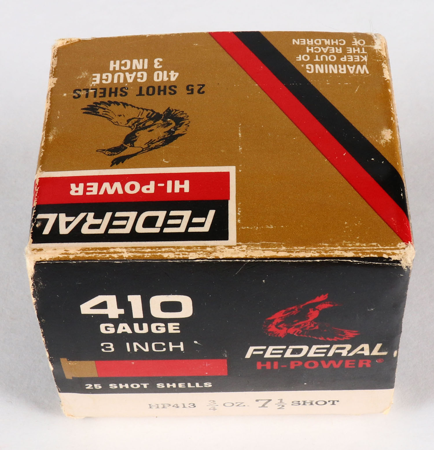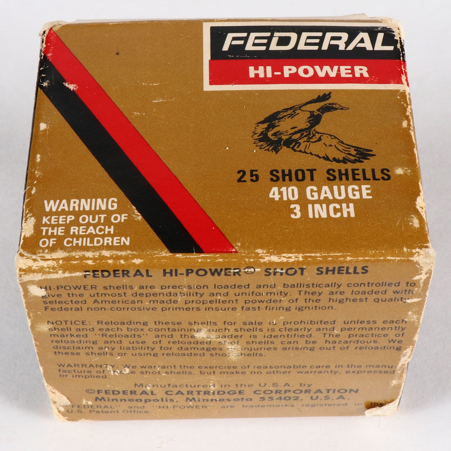 Federal, Hi-Power, 410ga., 1pc., Full, shot size 7 1/2, box is solid with great colors, paper shells are excellent. Grade: Very Good ++ - Value: 10 to 30