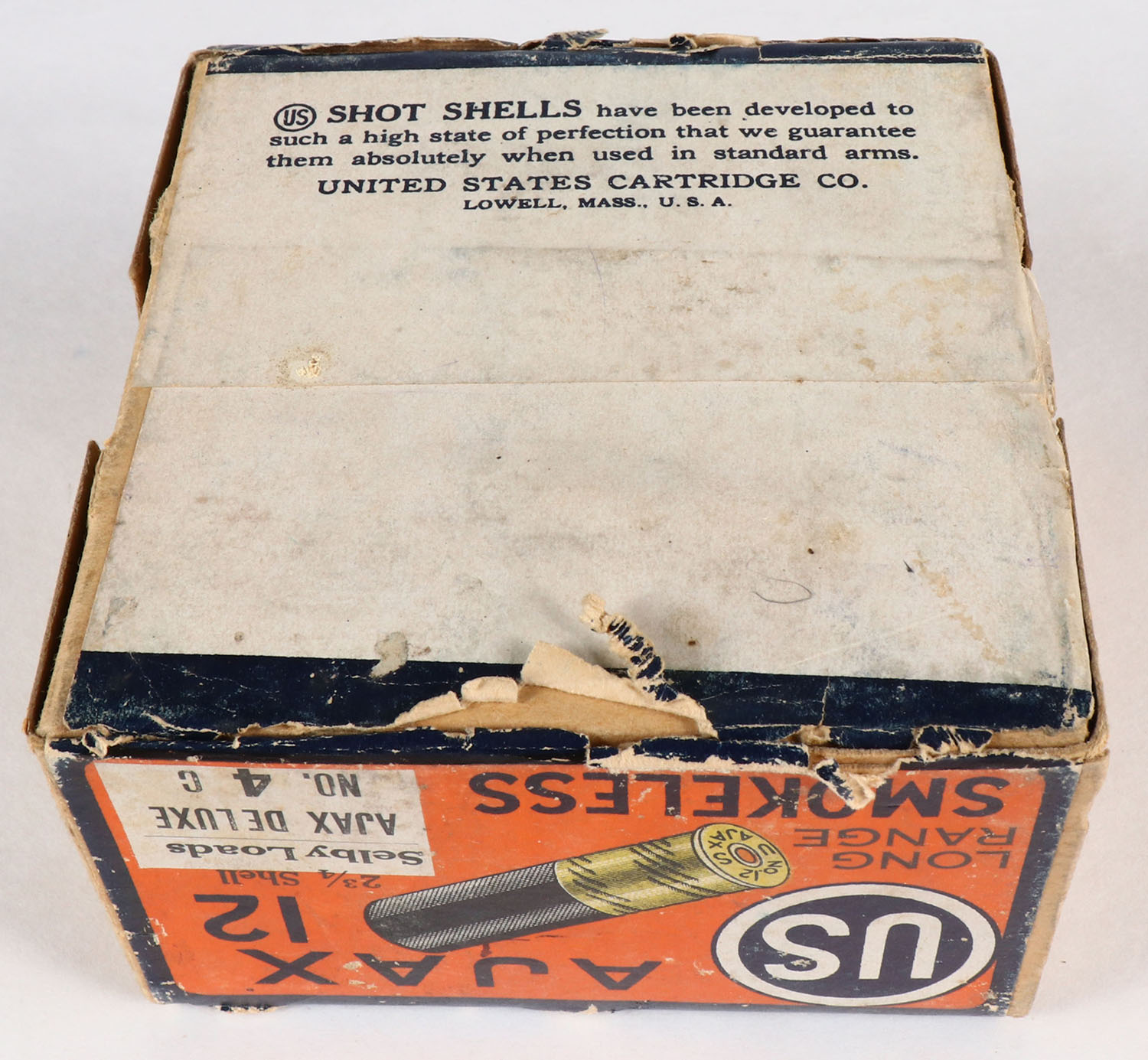 US Cart. Co., Lowell, Mass, Ajax, 12ga, 2pc., Empty, shot size 4C, buff box orange, blue & white label, box has light age soiling & edge wear with great colors. Grade: Very Good ++ - Value: 20 to 60