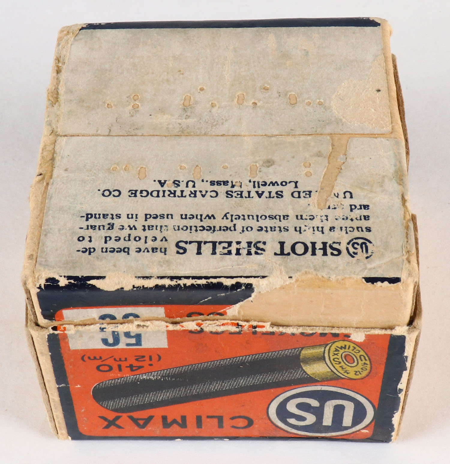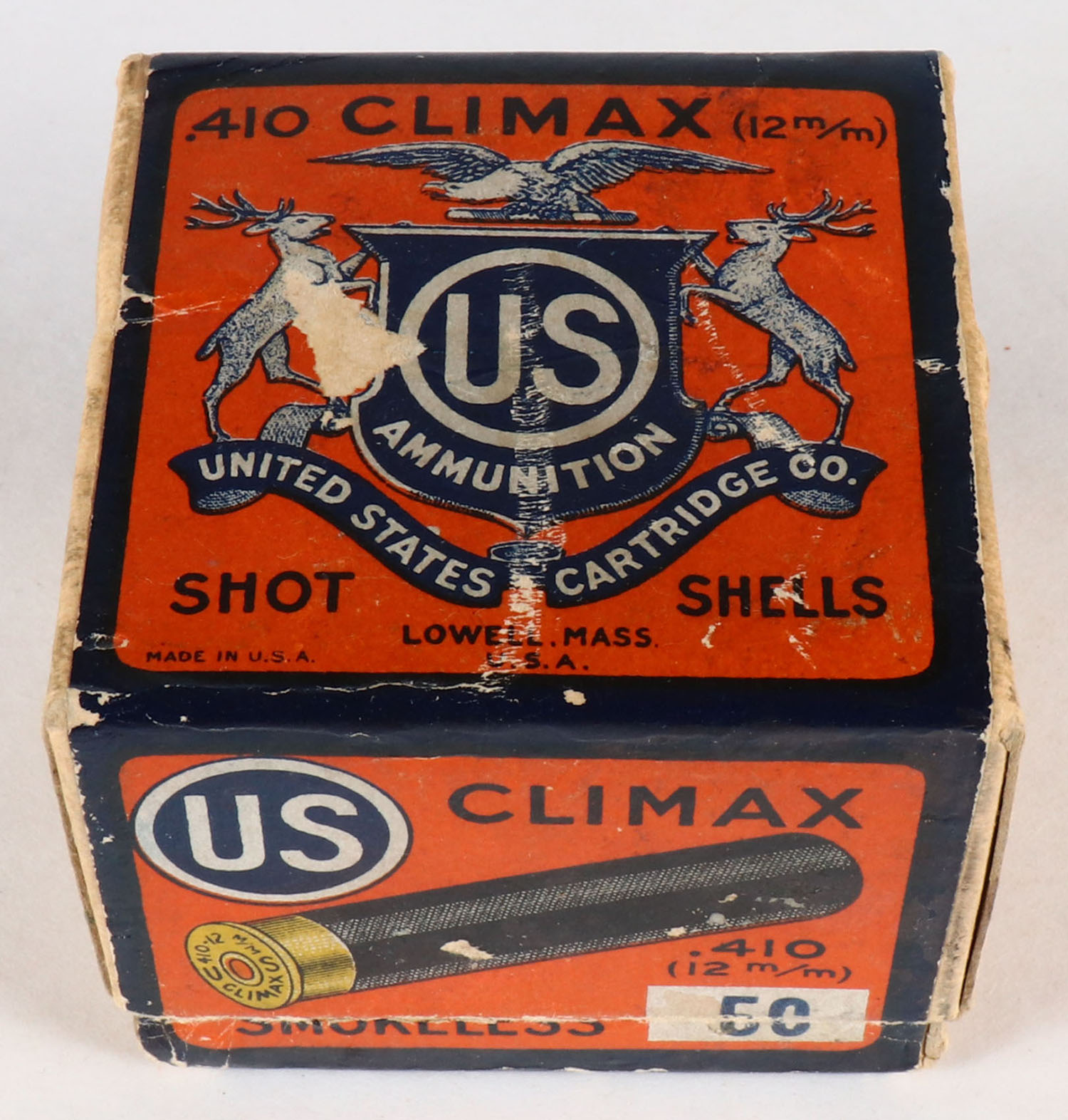 US Cart. Co., Lowell, Mass, Climax, 410ga, 2pc., shot size 5c, Full with 5rds. Being shot size 10C, buff box orange, blue & white label, box has scuffing with light edge wear. Paper shells are good. Grade: Very Good ++ - Value: 40 to 200