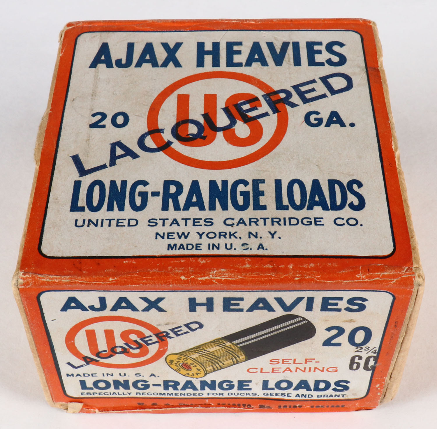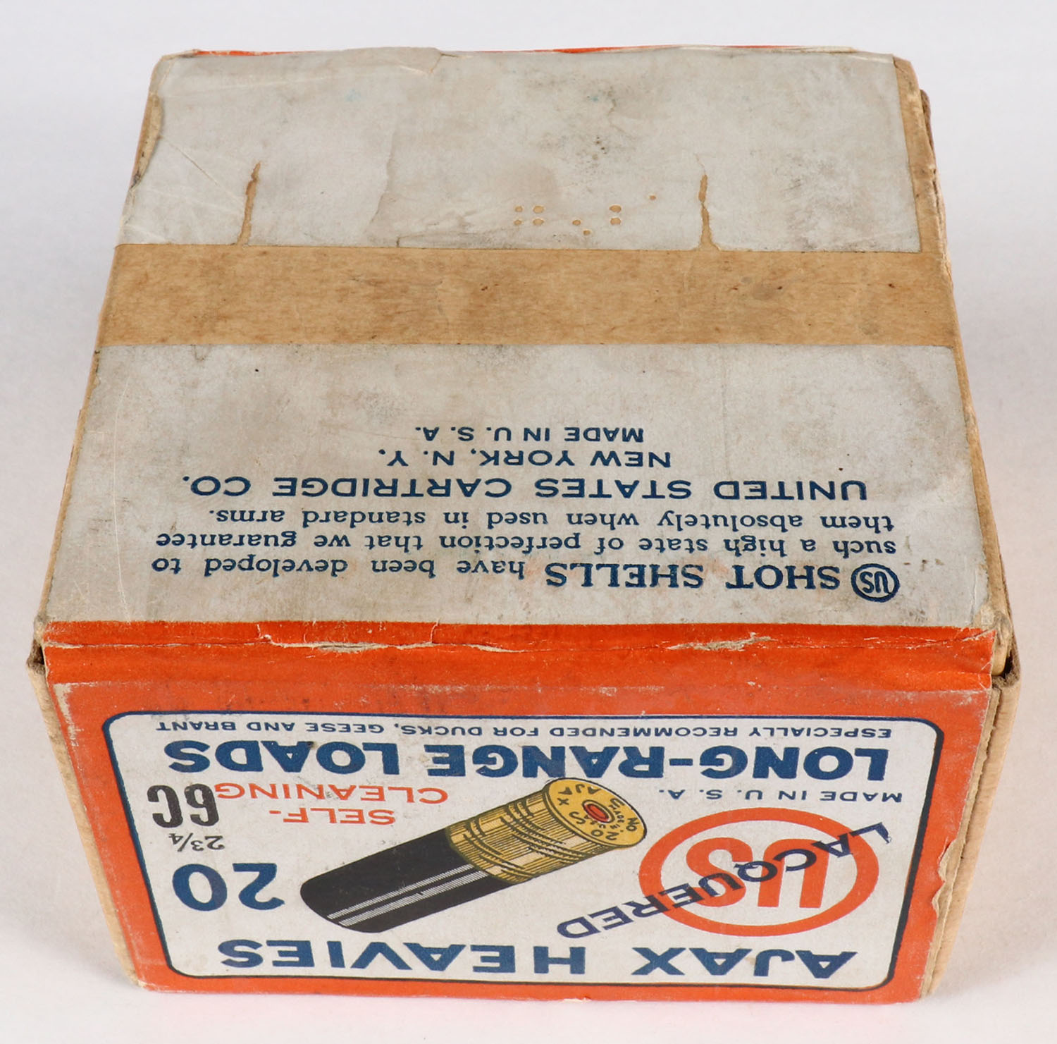 U.S. Cart. Co., New York, NY, AJAX HEAVIES, Long Range Loads, 20ga., 2pc., FULL & SEALED, Lacquered, shot size 6C, buff box with white, orange & blue paper label, box is very solid with great colors. Grade: Excellent ++ - Value: 100 to 500