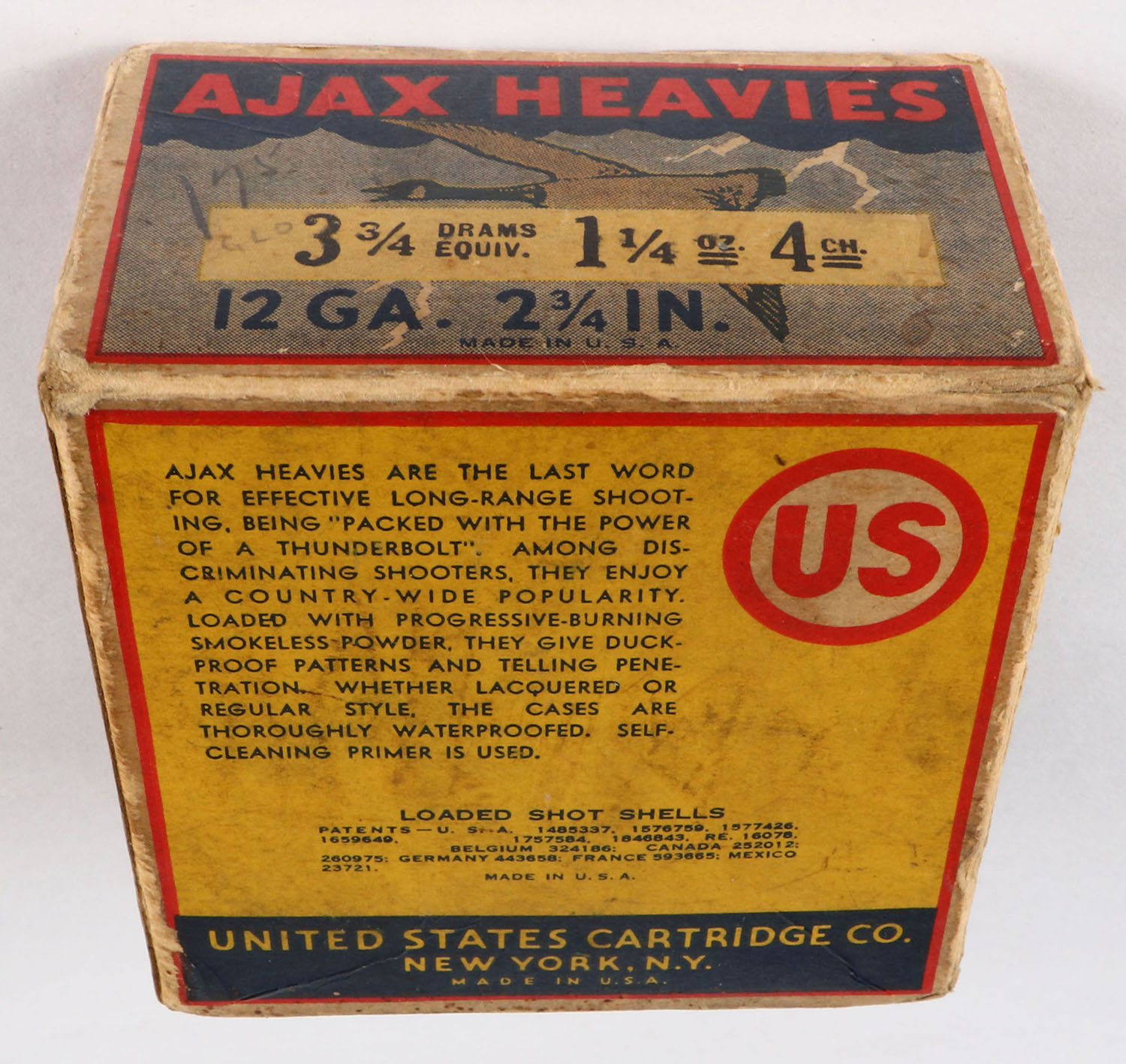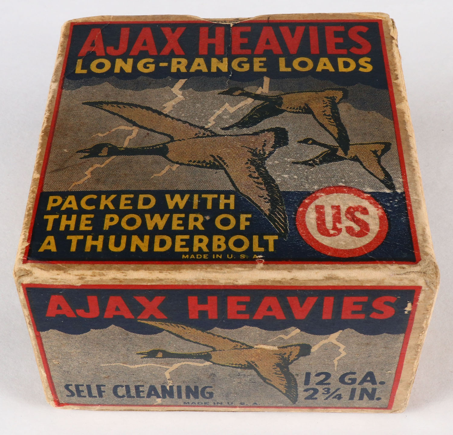 U.S. Cart. Co., AJAX HEAVIES, 12ga., 2 3/4'', 1pc., Empty, shot size 4 CH, multi colored box with three geese in lighting storm, box is solid with some age soiling & edgewear, box is nice with great colors. Grade: Very Good ++ - Value: 400 to 800