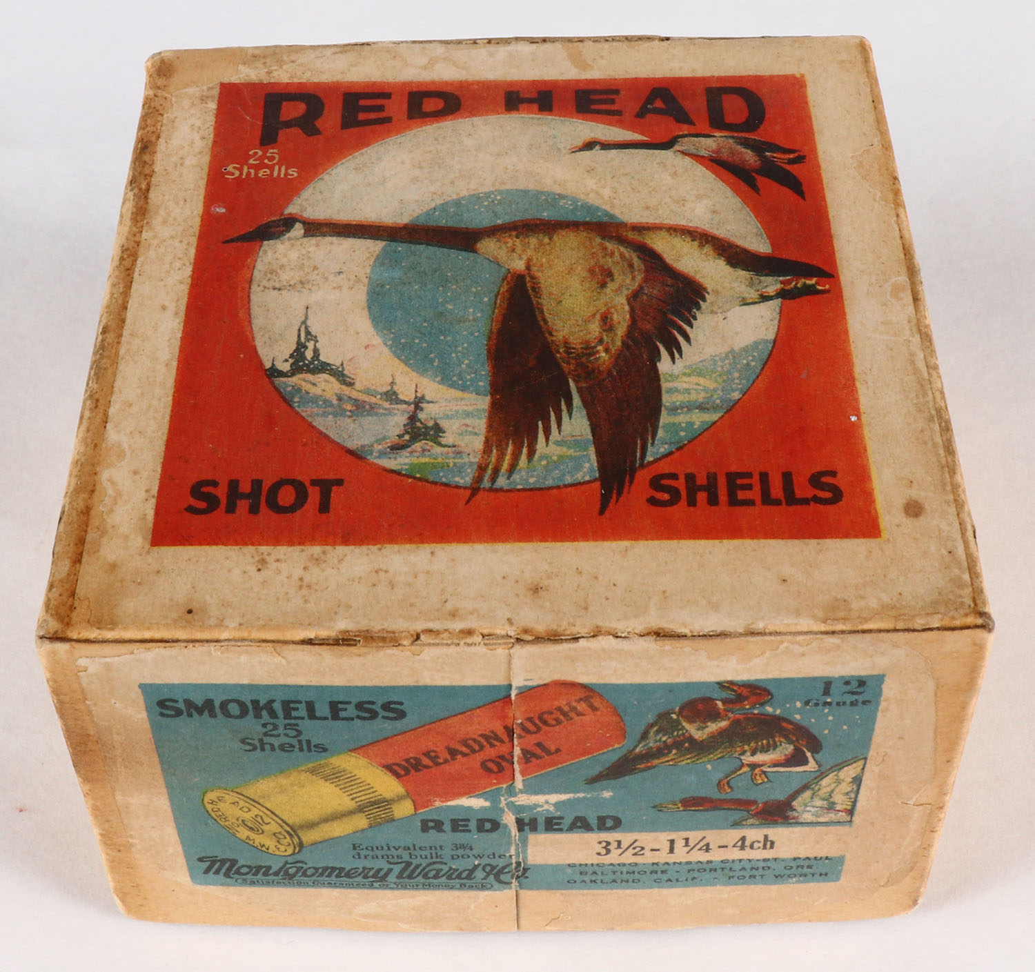 Montgomery Ward & Co., Red Head, Dreadnaught Oval, Has Early Side label, 12ga., 2pc., Empty, shot size 4ch, buff box with multi colored scene & two geese flying, box has light scuffing & light soiling with great colors. Grade: Very Good ++ - Value: 40 to 100