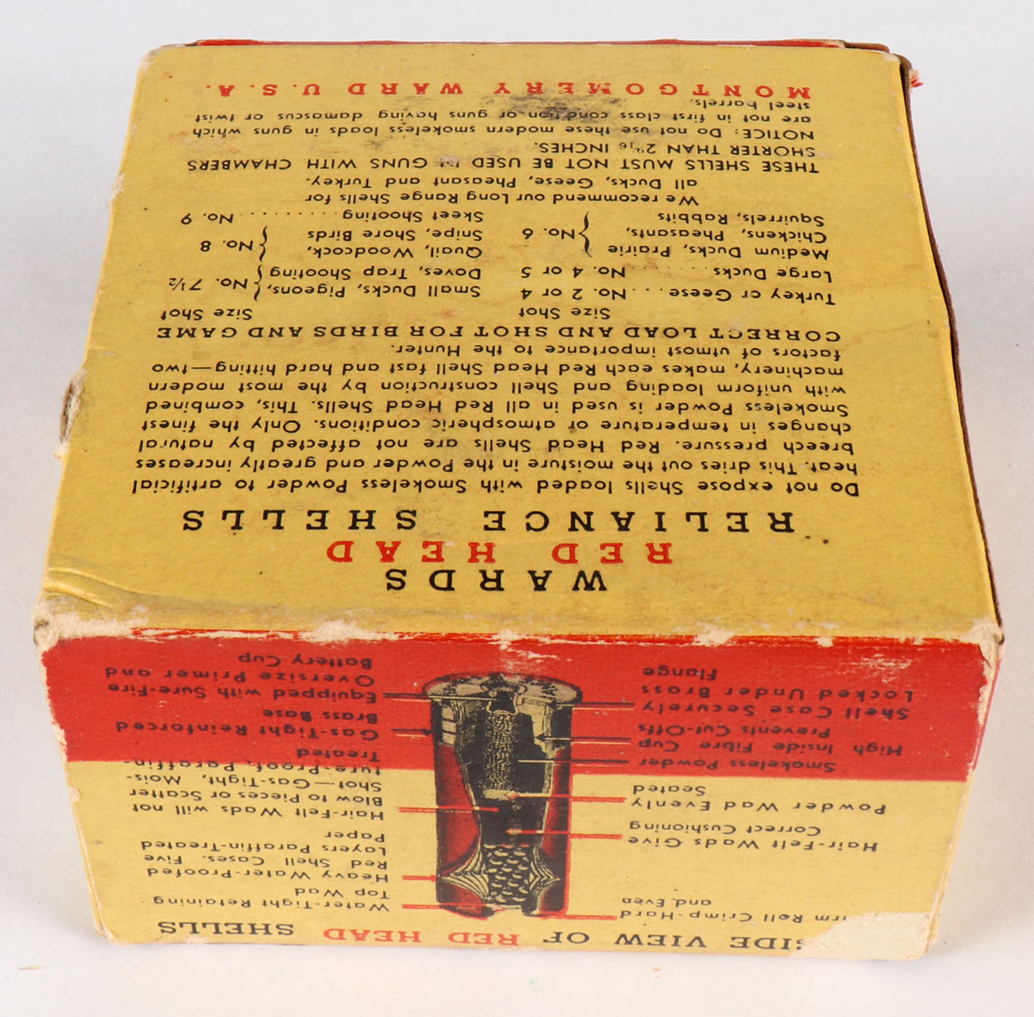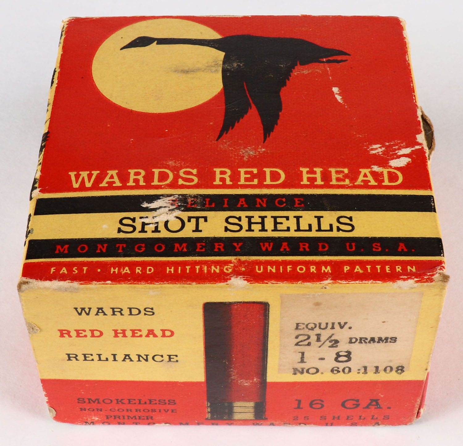 Montgomery Ward & Co., Red Head Reliance, 16ga., 1pc., Full, shot size 8, red background with black goose flying through the moon, box has light age soiling, light edge wear, small shell protrusion & small tear with very nice colors, paper shells are excellent. Grade: Very Good - Value: 20 to 80
