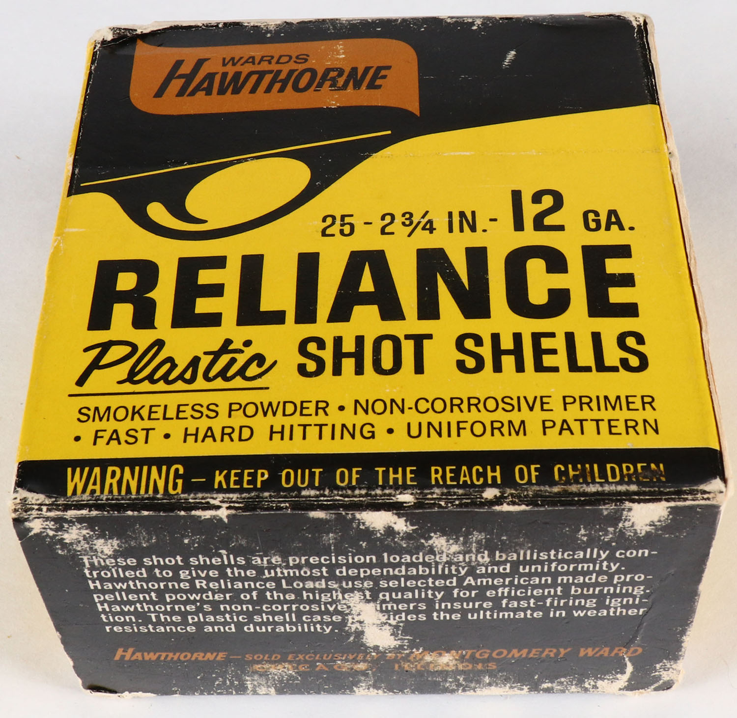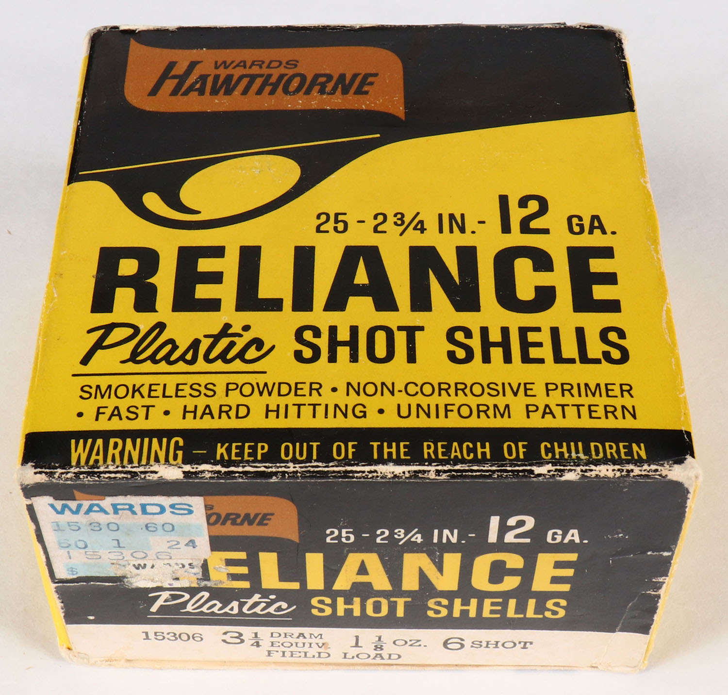 Wards Hawthorne, Reliance Plastic Shot Shells, 12 ga., 2 3/4'', 1pc., Full, shot size 6, box has age soiling with some scuffing, shells are excellent. Grade: Very Good + - Value: 8 to 30