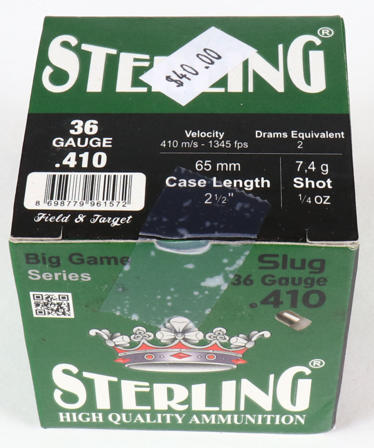 Sterling, Big Game Series, 410ga., 1pc., Full, shot size Slug, box is very solid, shells are excellent. Grade: MINT - Value: 8 to 30