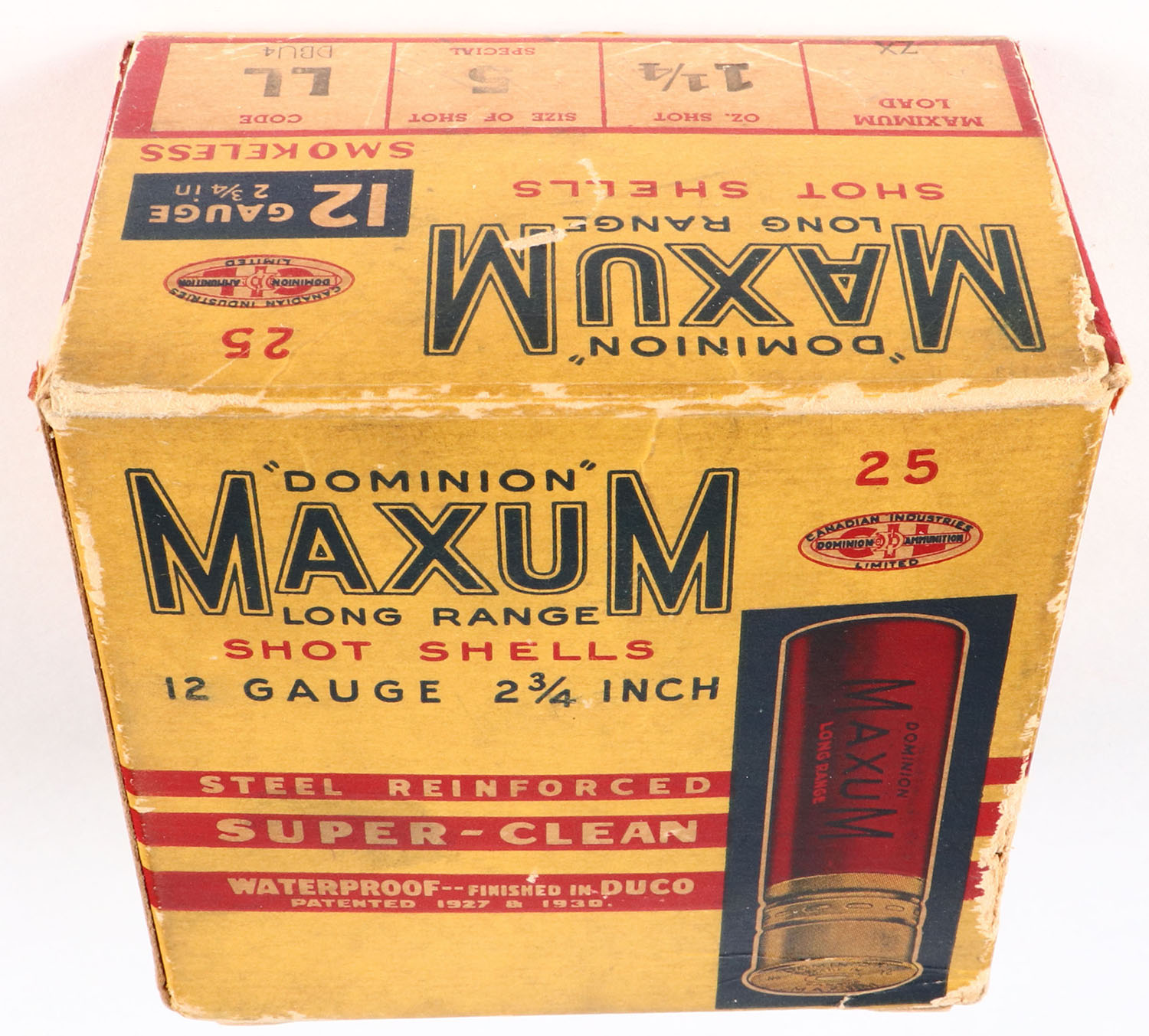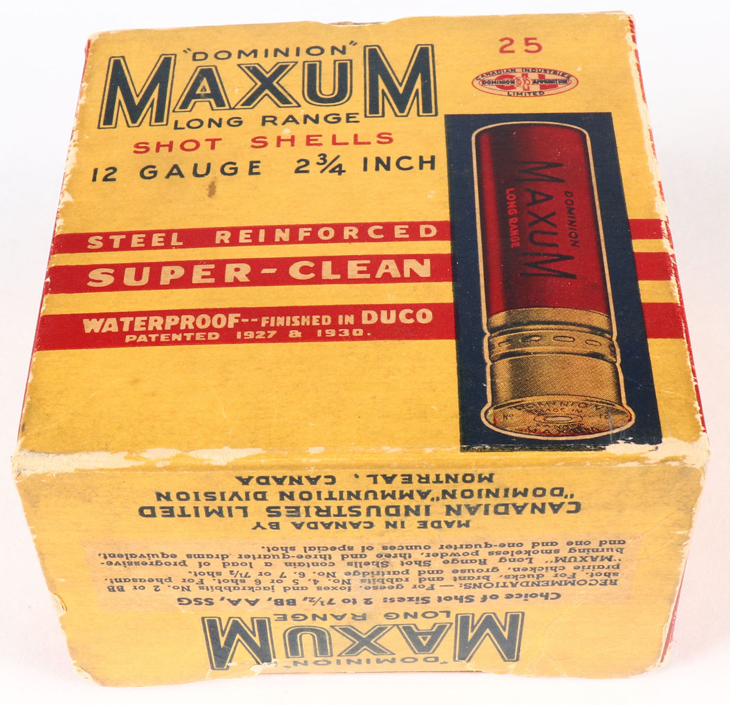 CIL, Maxum, 12ga., 1pc., Empty, shot size 5, buff box with great colors, box has scuffing with some edge wear. Grade: Very Good ++ - Value: 20 to 100