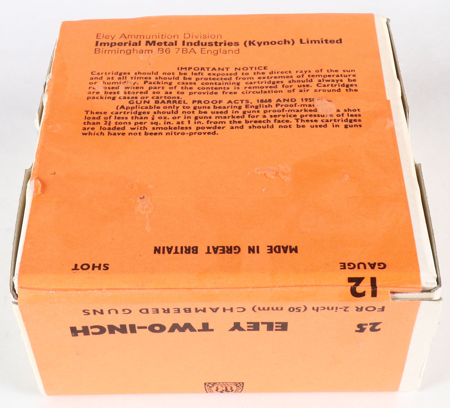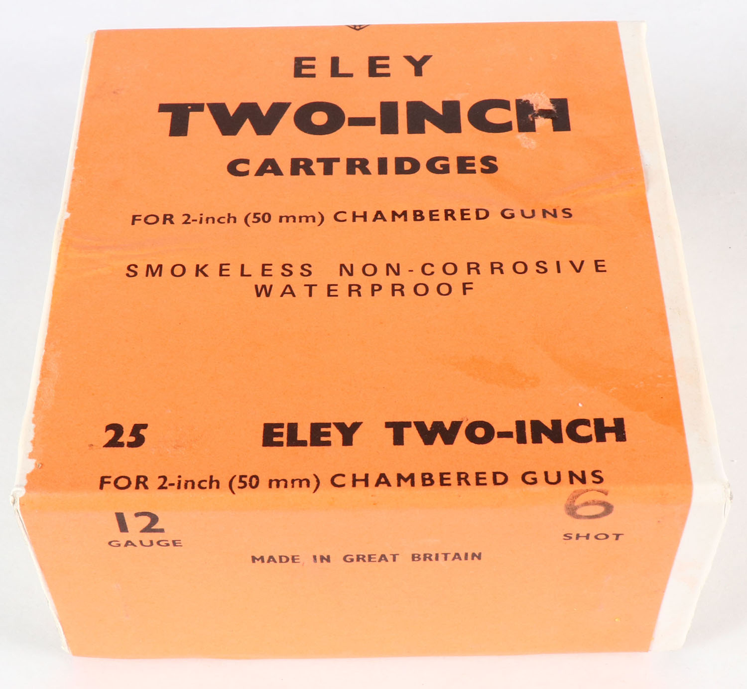 Eley, 12ga., 2pc., Two-Inch Cartridges, FULL & SEALED, shot size 6, buff box with multi-colored label, Grade: Excellent + - Value: 40 to 100