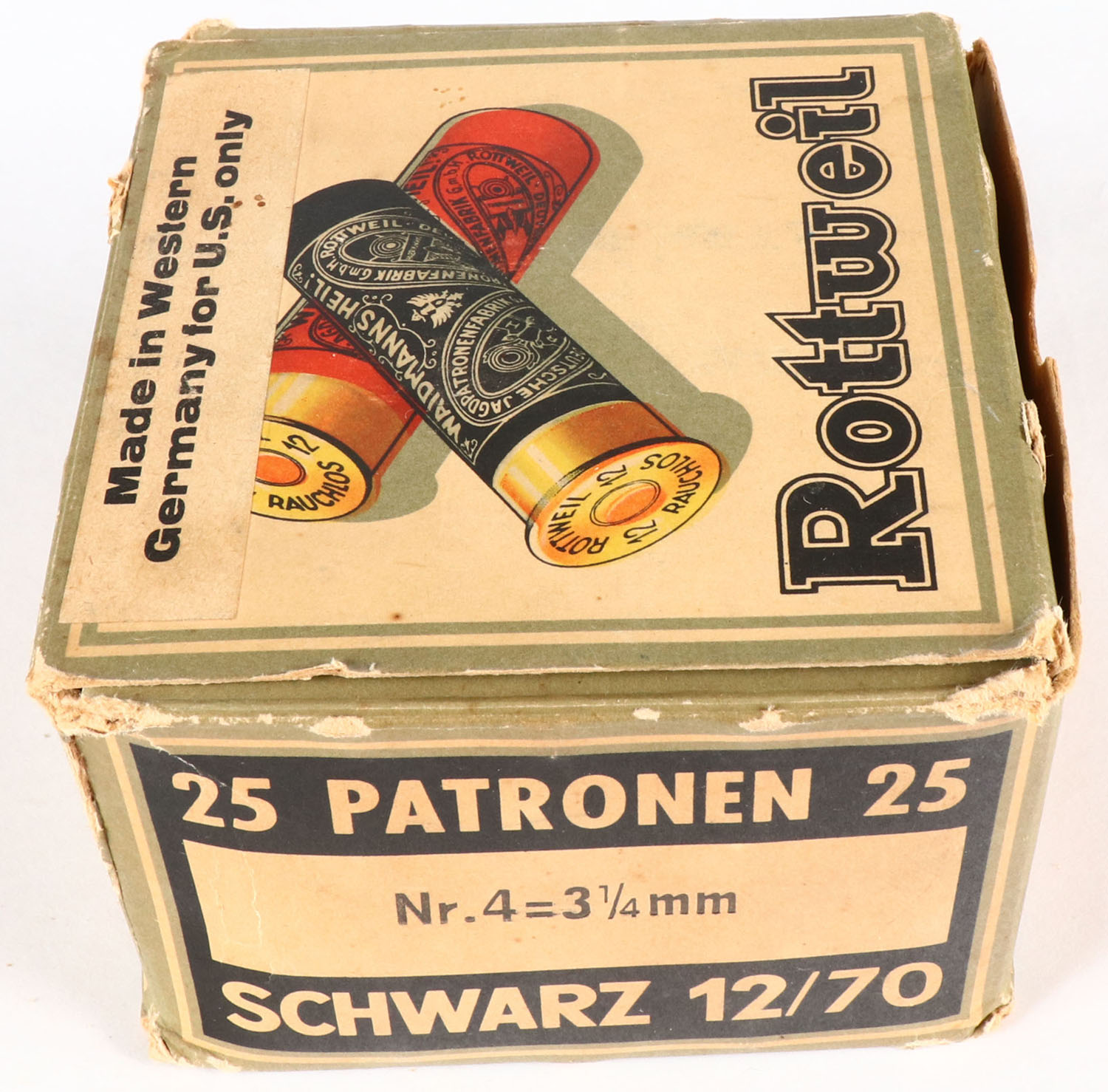 Rottweil Rauchlos, has original Insert, 12ga., 1pc., Full, shot size 4, buff box with multi colors, box has edge wear with a seam split, shells are excellent. Grade: Very Good ++ - Value: 10 to 40