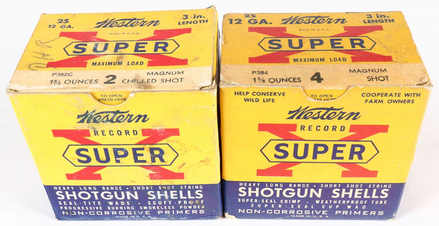 Lot of 2 Western, 12ga., 1pc., Appears full, shot size 4 Magnum & 2 CH. Magnum, multi-colored boxes. Grade: Very Good - Value: 10 to 30